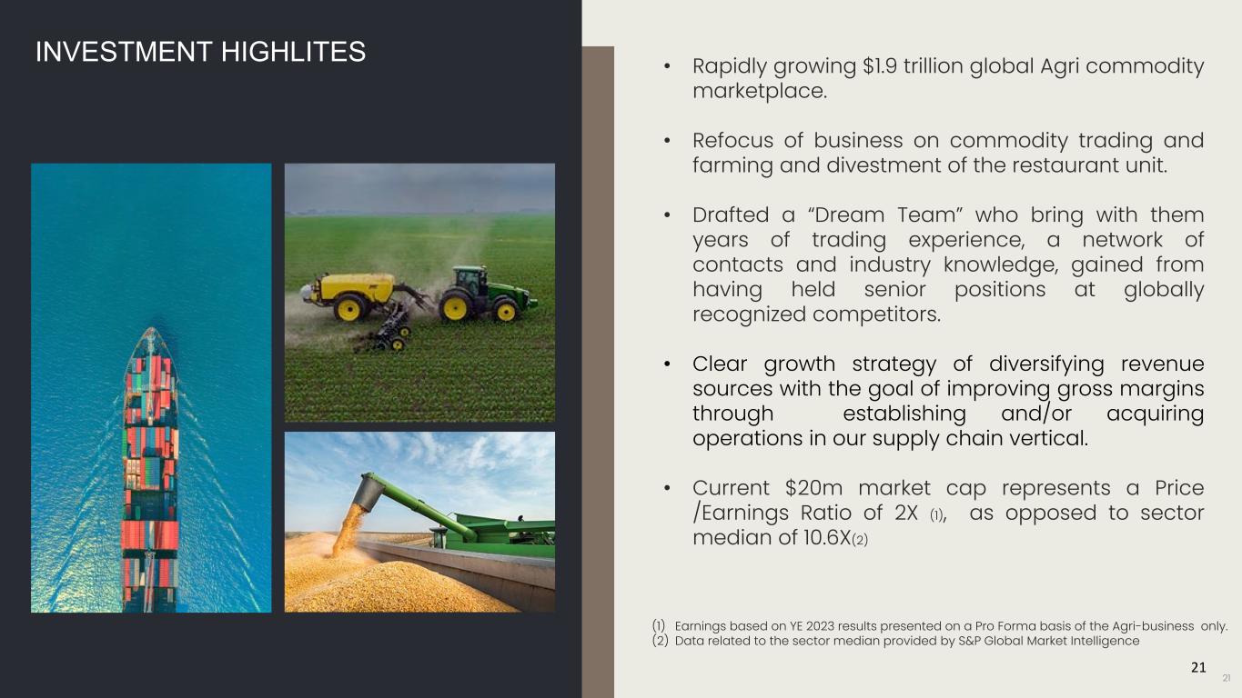 21 • Rapidly growing $1.9 trillion global Agri commodity marketplace. • Refocus of business on commodity trading and farming and divestment of the restaurant unit. • Drafted a “Dream Team” who bring with them years of trading experience, a network of contacts and industry knowledge, gained from having held senior positions at globally recognized competitors. • Clear growth strategy of diversifying revenue sources with the goal of improving gross margins through establishing and/or acquiring operations in our supply chain vertical. • Current $20m market cap represents a Price /Earnings Ratio of 2X (1), as opposed to sector median of 10.6X(2) INVESTMENT HIGHLITES 21 (1) Earnings based on YE 2023 results presented on a Pro Forma basis of the Agri-business only. (2) Data related to the sector median provided by S&P Global Market Intelligence