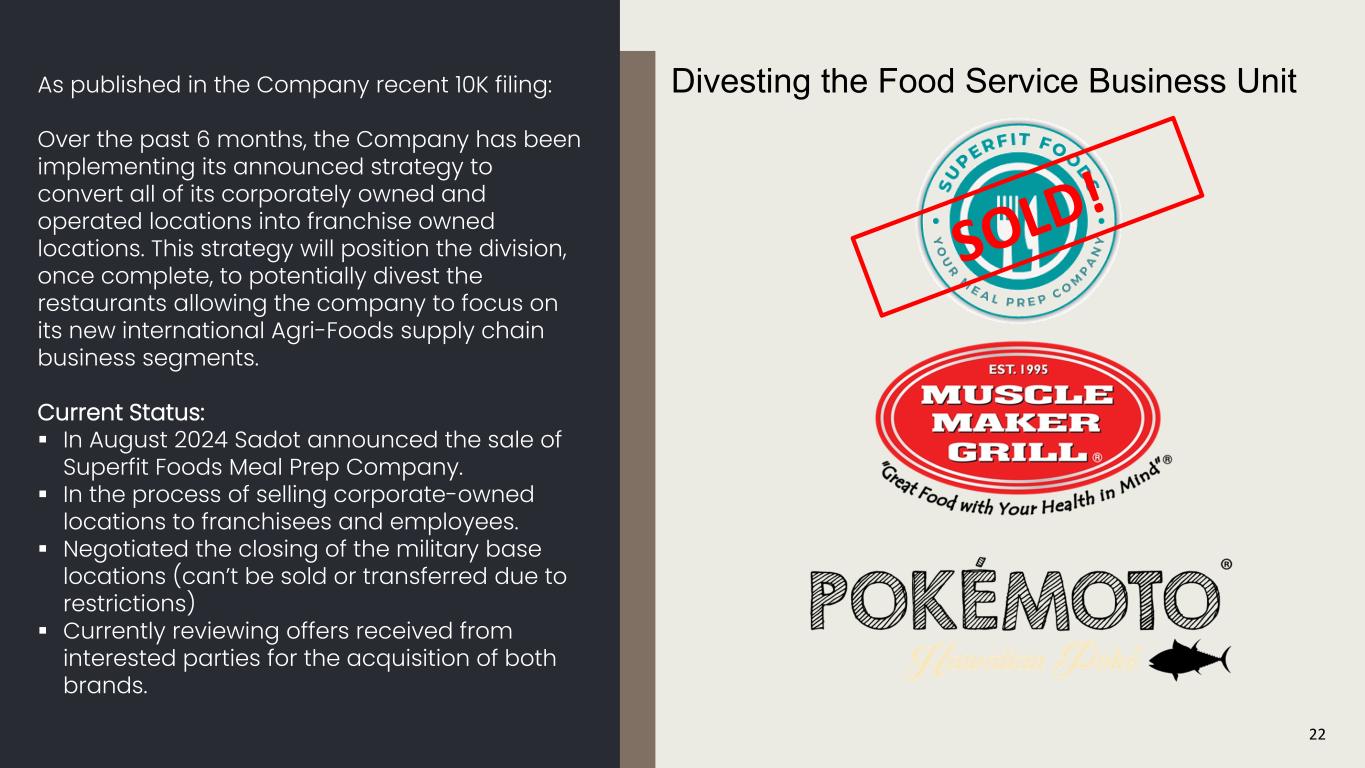 22 Divesting the Food Service Business UnitAs published in the Company recent 10K filing: Over the past 6 months, the Company has been implementing its announced strategy to convert all of its corporately owned and operated locations into franchise owned locations. This strategy will position the division, once complete, to potentially divest the restaurants allowing the company to focus on its new international Agri-Foods supply chain business segments. Current Status:  In August 2024 Sadot announced the sale of Superfit Foods Meal Prep Company.  In the process of selling corporate-owned locations to franchisees and employees.  Negotiated the closing of the military base locations (can’t be sold or transferred due to restrictions)  Currently reviewing offers received from interested parties for the acquisition of both brands.