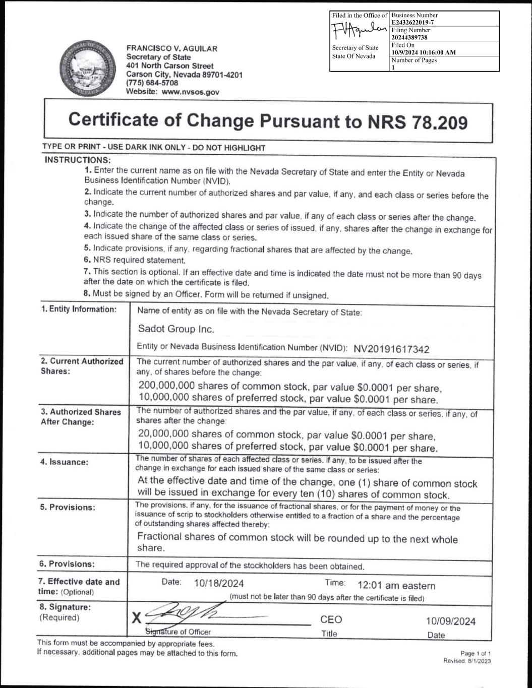 Filed in the Office of Secretary of State State Of Nevada Business Number E2432622019-7 Filing Number 20244389738 Filed On 10/9/2024 10:16:00 AM Number of Pages 1