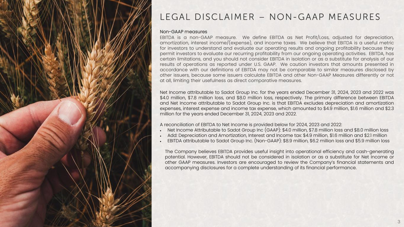This presentation includes "forward-looking statements." To the extent that the information presented in this presentation discusses financial projections, information, or expectations about our business plans, results of operations, products or markets, or otherwise makes statements about future events, such statements are forward-looking. Such forward-looking statements can be identified by the use of words such as "should," "may," "intends," "anticipates," "believes," "estimates," "projects," "forecasts," "expects," "plans," “pro-forma,” “goals,” "proposes,“ and words of similar import. Although we believe that the expectations reflected in these forward-looking statements are based on reasonable assumptions, there are a number of risks and uncertainties that could cause actual results to differ materially from such forward-looking statements. You are urged to carefully review and consider any cautionary statements and other disclosures, including the statements made under the heading "Risk Factors" and elsewhere in the Company's annual report on Form 10-K for its fiscal year ended December 31, 2024, and any subsequent filings with the U.S. Securities and Exchange Commission. Forward-looking statements contained in this presentation speak only as of the date of this presentation or as otherwise indicated and Sadot Group Inc. does not undertake any duty to update any forward-looking statements except as may be required by law. Legal Disclaimer: Preliminary Unaudited Financials Statement The preliminary, unaudited financial results included in this presentation are based on information available as of March 31, 2025, management’s initial review of operations and financial results as of such date. They remain subject to change based on the completion of the Company’s customary quarterly financial closing and review procedures and are forward-looking statements. The Company assumes no obligation to update these statements, except as may be required by law. The actual results may be materially different and are affected by the risk factors and uncertainties identified in this presentation and in the Company’s annual and quarterly filings with the Securities and Exchange Commission. Further, the Company’s independent auditor has not reviewed or performed any procedures on the preliminary, unaudited financial results. 2