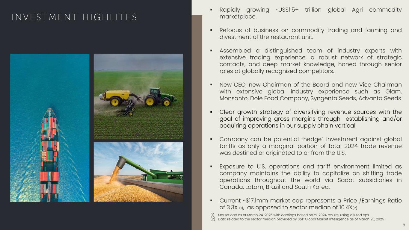 4 ▪ Building out operations to provide leverage to trading operations. ▪ Sourcing, buying and selling a wide variety of Agri-commodities worldwide. ▪ Actively engaged in the review of potential sales opportunities for Pokémoto and Muscle Maker Grill. The Company announced the sale of Superfit Foods on August 1, 2024. 4 Sadot Group Inc. (NASDAQ: SDOT) is an emerging global agri-commodities supply chain organization with farming, origination & trading operations located worldwide.