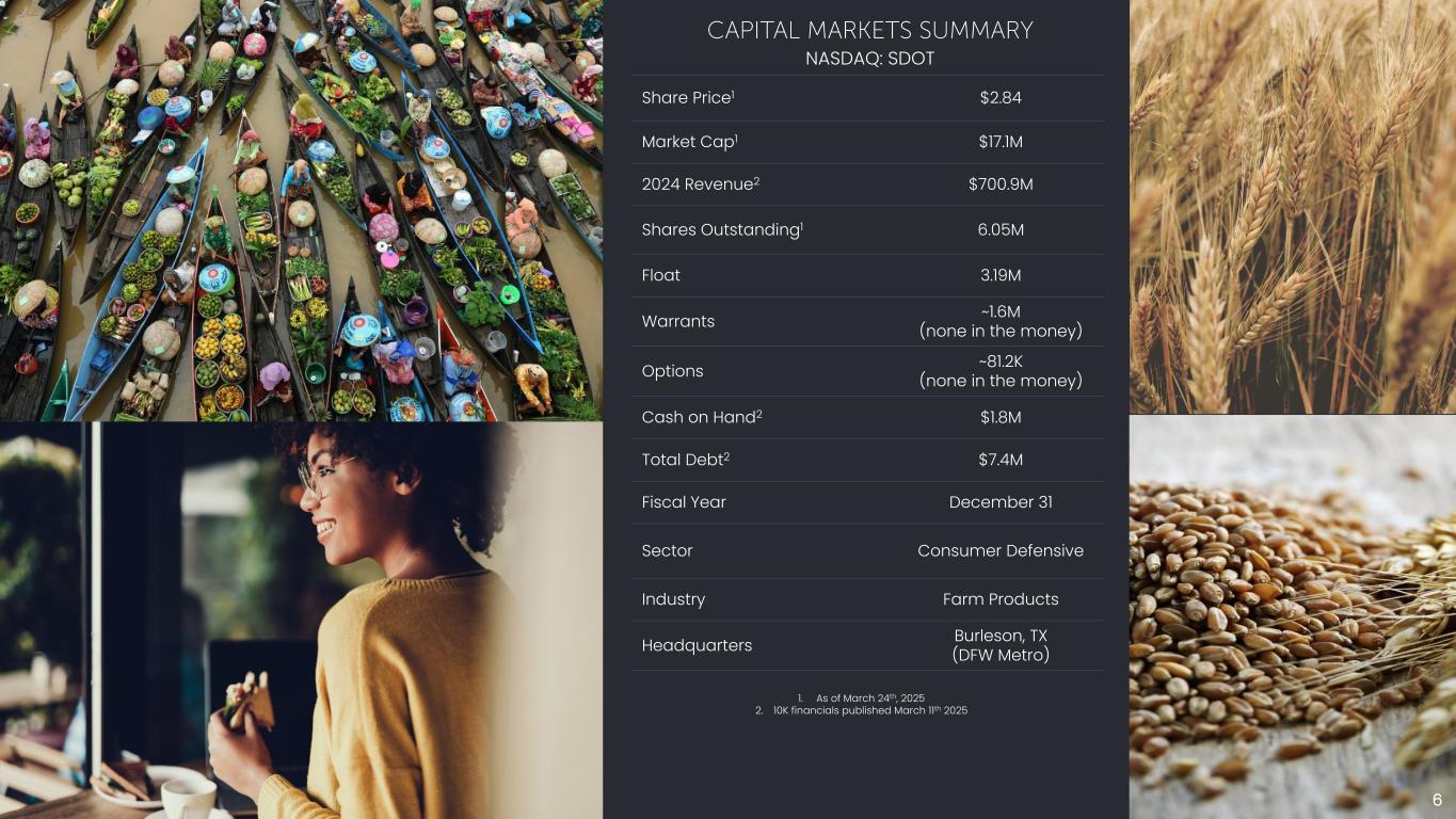 NASDAQ: SDOT Share Price1 $2.84 Market Cap1 $17.1M 2024 Revenue2 $700.9M Shares Outstanding1 6.05M Float 3.19M Warrants ~1.6M (none in the money) Options ~81.2K (none in the money) Cash on Hand2 $1.8M Total Debt2 $7.4M Fiscal Year December 31 Sector Consumer Defensive Industry Farm Products Headquarters Burleson, TX (DFW Metro) 1. As of March 24th, 2025 2. 10K financials published March 11th 2025 6