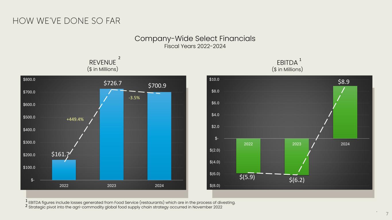 7 REVENUE ($ in Millions) EBITDA ($ in Millions) Company-Wide Select Financials Fiscal Years 2022-2024 7 EBITDA figures include losses generated from Food Service (restaurants) which are in the process of divesting. Strategic pivot into the agri-commodity global food supply chain strategy occurred in November 2022 1 1 2 $- $100.0 $200.0 $300.0 $400.0 $500.0 $600.0 $700.0 $800.0 2022 2023 2024 +449.4% -3.5% 2 $161.7 $726.7 $700.9 $(8.0) $(6.0) $(4.0) $(2.0) $- $2.0 $4.0 $6.0 $8.0 $10.0 2022 2023 2024 $(5.9) $(6.2) $8.9