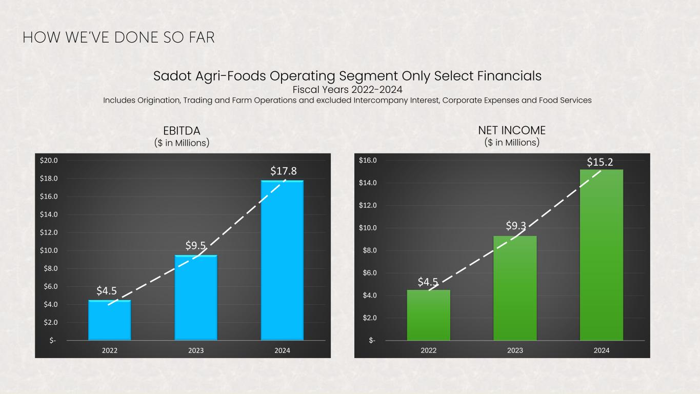 8 Sadot Agri-Foods Operating Segment Only Select Financials Fiscal Years 2022-2024 Includes Origination, Trading and Farm Operations and excluded Intercompany Interest, Corporate Expenses and Food Services EBITDA ($ in Millions) $- $2.0 $4.0 $6.0 $8.0 $10.0 $12.0 $14.0 $16.0 $18.0 $20.0 2022 2023 2024 $4.5 $9.5 $17.8 $- $2.0 $4.0 $6.0 $8.0 $10.0 $12.0 $14.0 $16.0 2022 2023 2024 $4.5 $9.3 $15.2 NET INCOME ($ in Millions)