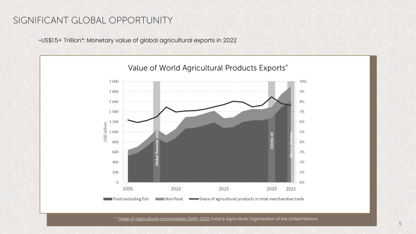 9 ~US$1.5+ Trillion*: Monetary value of global agricultural exports in 2022 * Trade of agricultural commodities 2005–2022, Food & Agriculture Organization of the United Nations