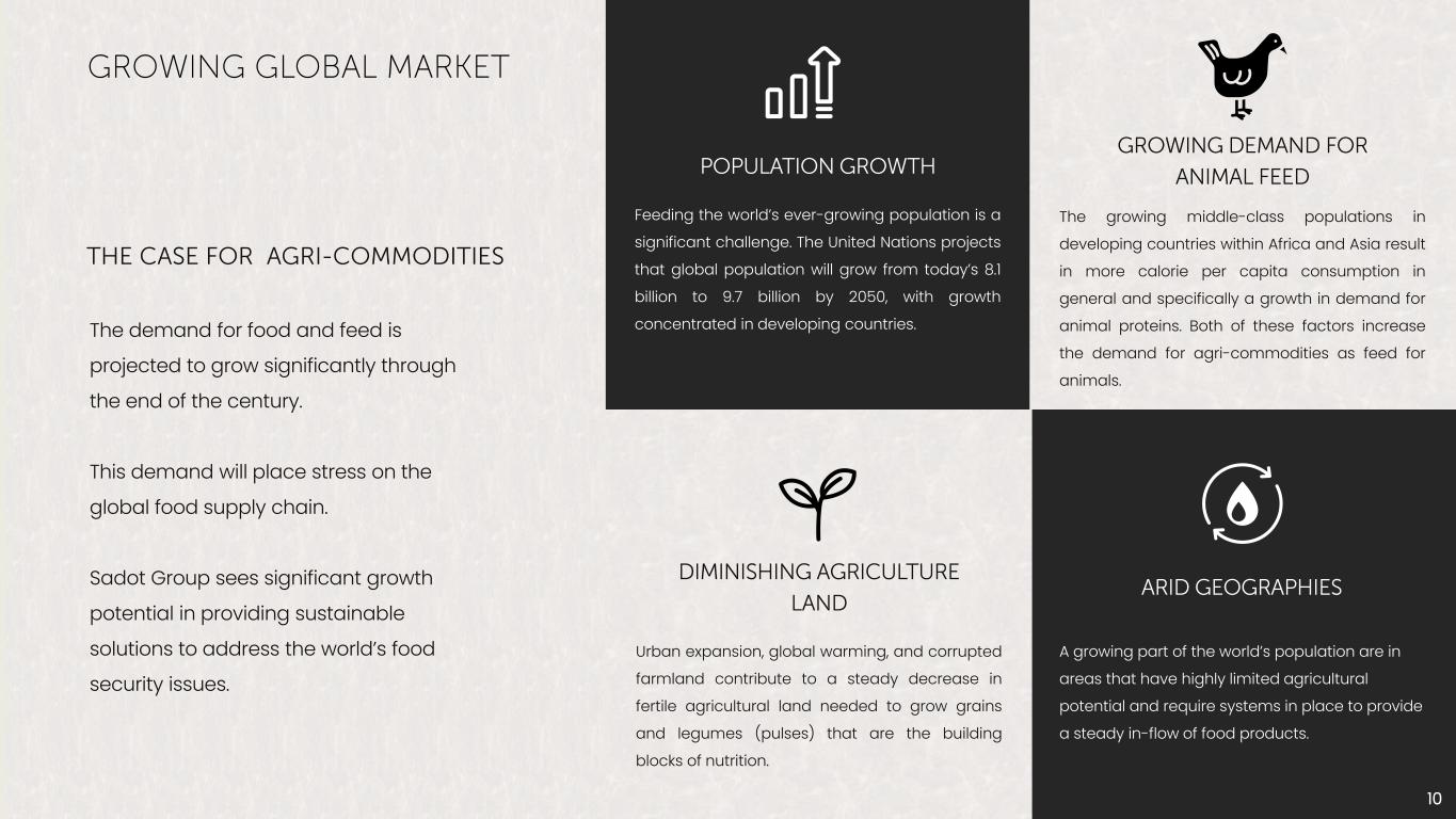 Feeding the world’s ever-growing population is a significant challenge. The United Nations projects that global population will grow from today’s 8.1 billion to 9.7 billion by 2050, with growth concentrated in developing countries. The growing middle-class populations in developing countries within Africa and Asia result in more calorie per capita consumption in general and specifically a growth in demand for animal proteins. Both of these factors increase the demand for agri-commodities as feed for animals. A growing part of the world’s population are in areas that have highly limited agricultural potential and require systems in place to provide a steady in-flow of food products. Urban expansion, global warming, and corrupted farmland contribute to a steady decrease in fertile agricultural land needed to grow grains and legumes (pulses) that are the building blocks of nutrition. 10 The demand for food and feed is projected to grow significantly through the end of the century. This demand will place stress on the global food supply chain. Sadot Group sees significant growth potential in providing sustainable solutions to address the world’s food security issues.