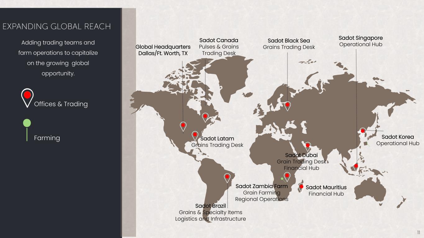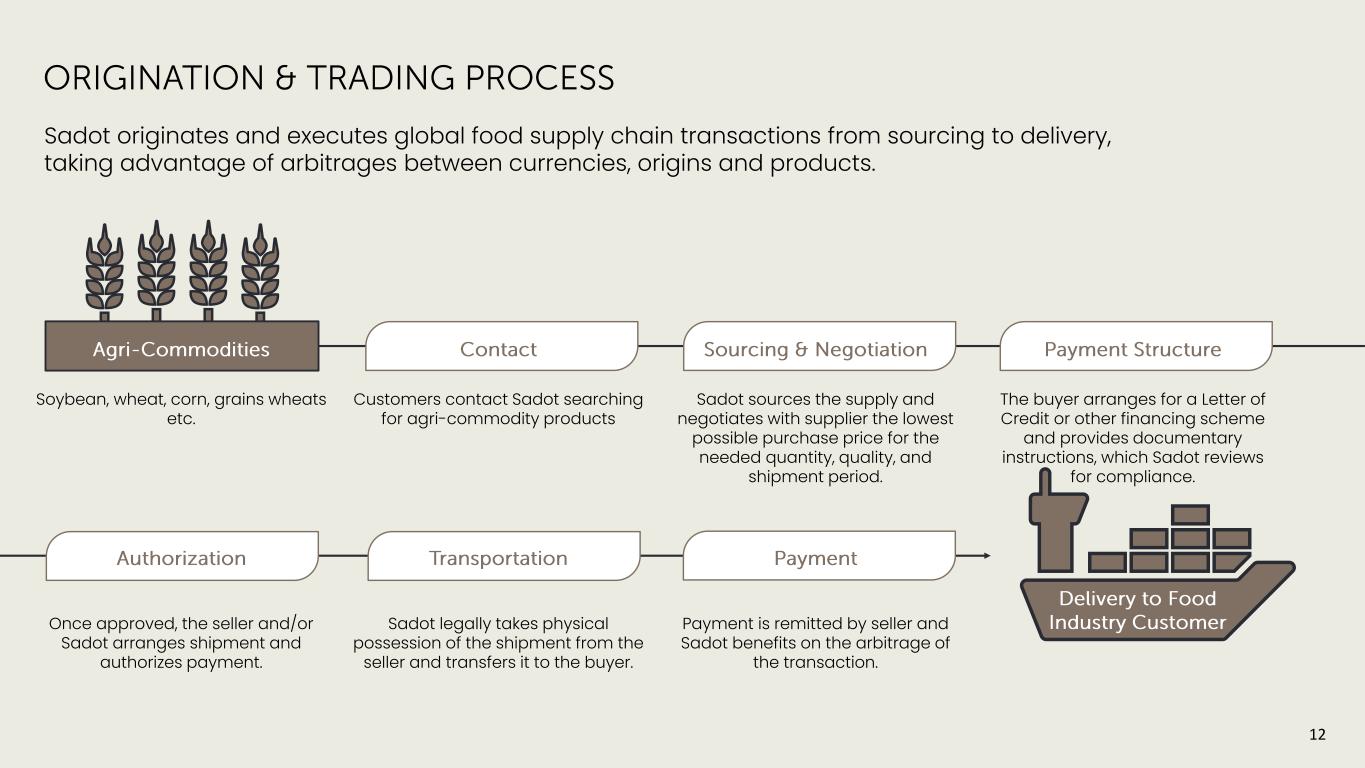 Sadot Canada Pulses & Grains Trading Desk Global Headquarters Dallas/Ft. Worth, TX Sadot Latam Grains Trading Desk Sadot Mauritius Financial Hub Sadot Zambia Farm Grain Farming Regional Operations Sadot Dubai Grain Trading Desk Financial Hub Sadot Singapore Operational Hub Sadot Brazil Grains & Specialty Items Logistics and Infrastructure Sadot Black Sea Grains Trading Desk Offices & Trading Farming Adding trading teams and farm operations to capitalize on the growing global opportunity. 11 Sadot Korea Operational Hub