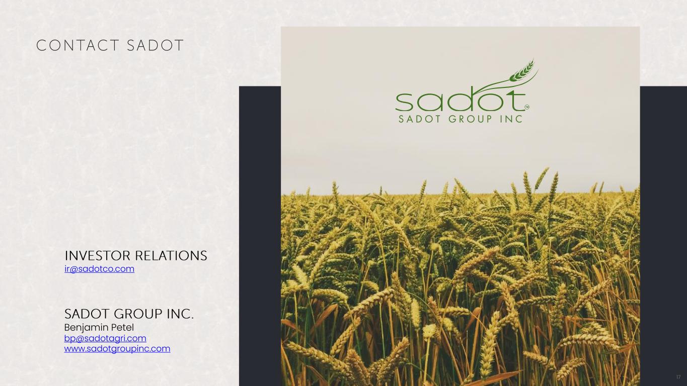 S A D O T G R O U P I N C 17 Benjamin Petel bp@sadotagri.com www.sadotgroupinc.com ir@sadotco.com