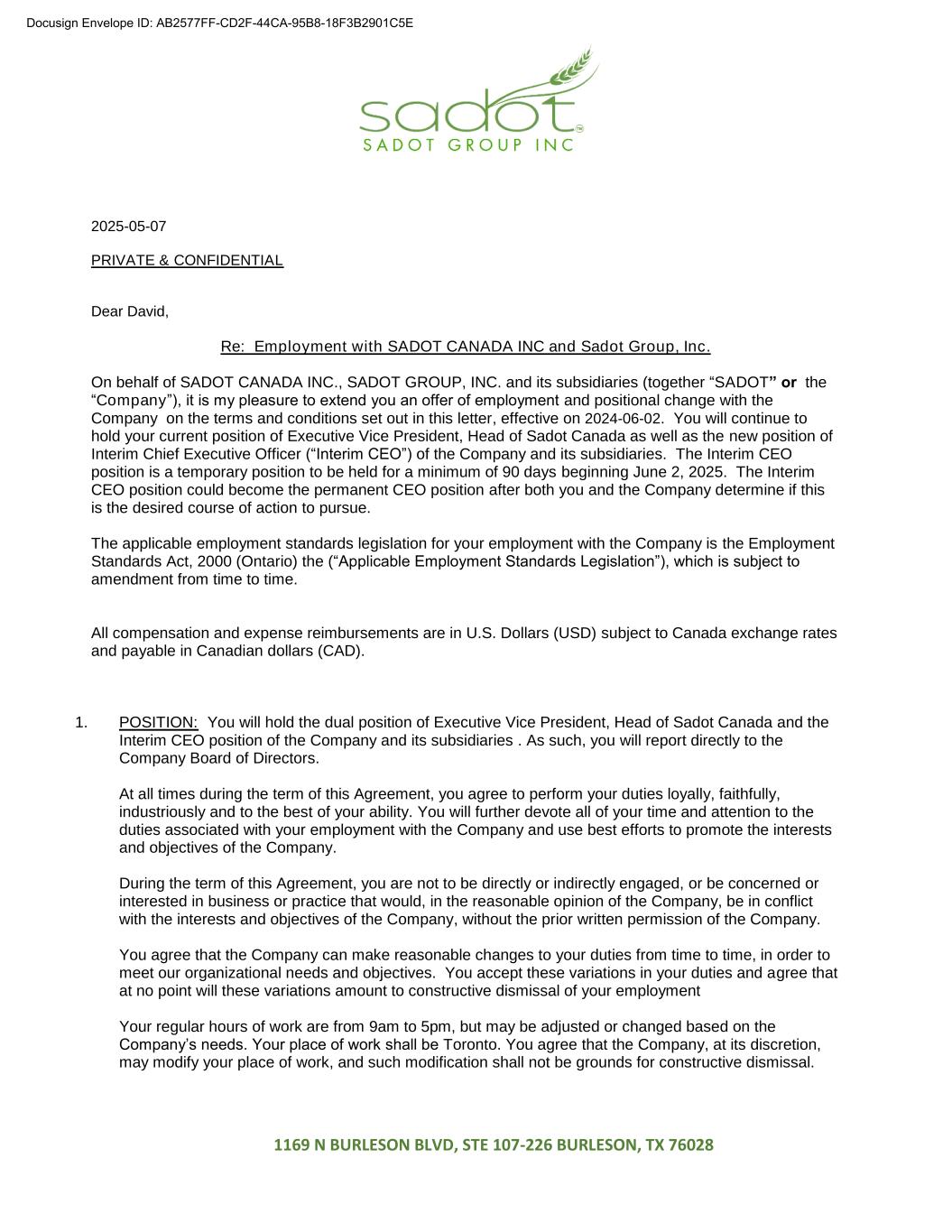 1169 N BURLESON BLVD, STE 107-226 BURLESON, TX 76028 2025-05-07 PRIVATE & CONFIDENTIAL Dear David, Re: Employment with SADOT CANADA INC and Sadot Group, Inc. On behalf of SADOT CANADA INC., SADOT GROUP, INC. and its subsidiaries (together “SADOT” or the “Company”), it is my pleasure to extend you an offer of employment and positional change with the Company on the terms and conditions set out in this letter, effective on 2024-06-02. You will continue to hold your current position of Executive Vice President, Head of Sadot Canada as well as the new position of Interim Chief Executive Officer (“Interim CEO”) of the Company and its subsidiaries. The Interim CEO position is a temporary position to be held for a minimum of 90 days beginning June 2, 2025. The Interim CEO position could become the permanent CEO position after both you and the Company determine if this is the desired course of action to pursue. The applicable employment standards legislation for your employment with the Company is the Employment Standards Act, 2000 (Ontario) the (“Applicable Employment Standards Legislation”), which is subject to amendment from time to time. All compensation and expense reimbursements are in U.S. Dollars (USD) subject to Canada exchange rates and payable in Canadian dollars (CAD). 1. POSITION: You will hold the dual position of Executive Vice President, Head of Sadot Canada and the Interim CEO position of the Company and its subsidiaries . As such, you will report directly to the Company Board of Directors. At all times during the term of this Agreement, you agree to perform your duties loyally, faithfully, industriously and to the best of your ability. You will further devote all of your time and attention to the duties associated with your employment with the Company and use best efforts to promote the interests and objectives of the Company. During the term of this Agreement, you are not to be directly or indirectly engaged, or be concerned or interested in business or practice that would, in the reasonable opinion of the Company, be in conflict with the interests and objectives of the Company, without the prior written permission of the Company. You agree that the Company can make reasonable changes to your duties from time to time, in order to meet our organizational needs and objectives. You accept these variations in your duties and agree that at no point will these variations amount to constructive dismissal of your employment Your regular hours of work are from 9am to 5pm, but may be adjusted or changed based on the Company’s needs. Your place of work shall be Toronto. You agree that the Company, at its discretion, may modify your place of work, and such modification shall not be grounds for constructive dismissal. Docusign Envelope ID: AB2577FF-CD2F-44CA-95B8-18F3B2901C5E