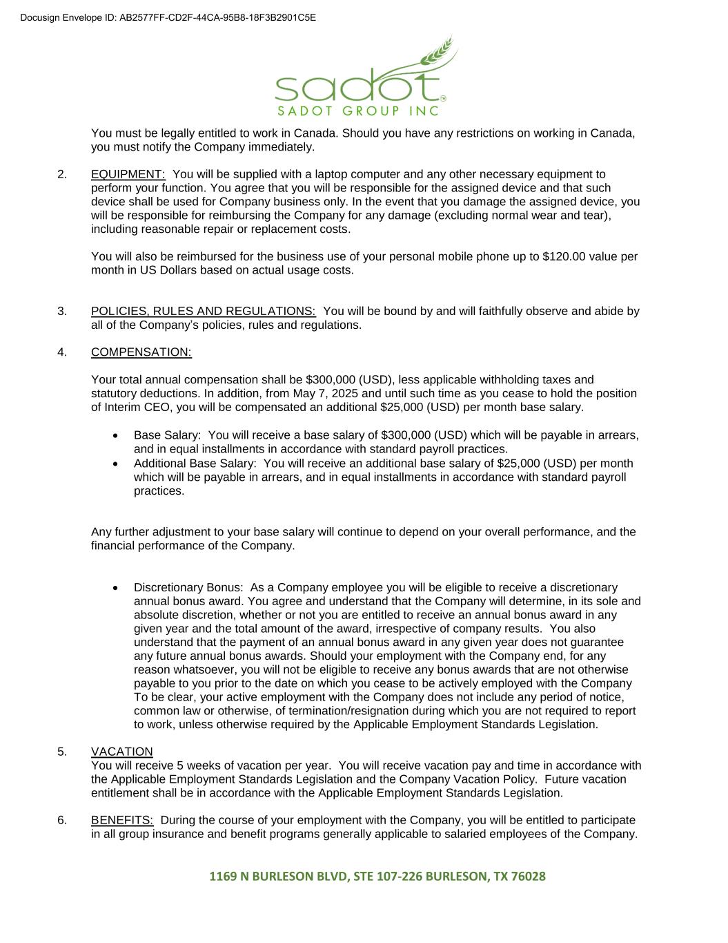 1169 N BURLESON BLVD, STE 107-226 BURLESON, TX 76028 You must be legally entitled to work in Canada. Should you have any restrictions on working in Canada, you must notify the Company immediately. 2. EQUIPMENT: You will be supplied with a laptop computer and any other necessary equipment to perform your function. You agree that you will be responsible for the assigned device and that such device shall be used for Company business only. In the event that you damage the assigned device, you will be responsible for reimbursing the Company for any damage (excluding normal wear and tear), including reasonable repair or replacement costs. You will also be reimbursed for the business use of your personal mobile phone up to $120.00 value per month in US Dollars based on actual usage costs. 3. POLICIES, RULES AND REGULATIONS: You will be bound by and will faithfully observe and abide by all of the Company’s policies, rules and regulations. 4. COMPENSATION: Your total annual compensation shall be $300,000 (USD), less applicable withholding taxes and statutory deductions. In addition, from May 7, 2025 and until such time as you cease to hold the position of Interim CEO, you will be compensated an additional $25,000 (USD) per month base salary.  Base Salary: You will receive a base salary of $300,000 (USD) which will be payable in arrears, and in equal installments in accordance with standard payroll practices.  Additional Base Salary: You will receive an additional base salary of $25,000 (USD) per month which will be payable in arrears, and in equal installments in accordance with standard payroll practices. Any further adjustment to your base salary will continue to depend on your overall performance, and the financial performance of the Company.  Discretionary Bonus: As a Company employee you will be eligible to receive a discretionary annual bonus award. You agree and understand that the Company will determine, in its sole and absolute discretion, whether or not you are entitled to receive an annual bonus award in any given year and the total amount of the award, irrespective of company results. You also understand that the payment of an annual bonus award in any given year does not guarantee any future annual bonus awards. Should your employment with the Company end, for any reason whatsoever, you will not be eligible to receive any bonus awards that are not otherwise payable to you prior to the date on which you cease to be actively employed with the Company To be clear, your active employment with the Company does not include any period of notice, common law or otherwise, of termination/resignation during which you are not required to report to work, unless otherwise required by the Applicable Employment Standards Legislation. 5. VACATION You will receive 5 weeks of vacation per year. You will receive vacation pay and time in accordance with the Applicable Employment Standards Legislation and the Company Vacation Policy. Future vacation entitlement shall be in accordance with the Applicable Employment Standards Legislation. 6. BENEFITS: During the course of your employment with the Company, you will be entitled to participate in all group insurance and benefit programs generally applicable to salaried employees of the Company. Docusign Envelope ID: AB2577FF-CD2F-44CA-95B8-18F3B2901C5E