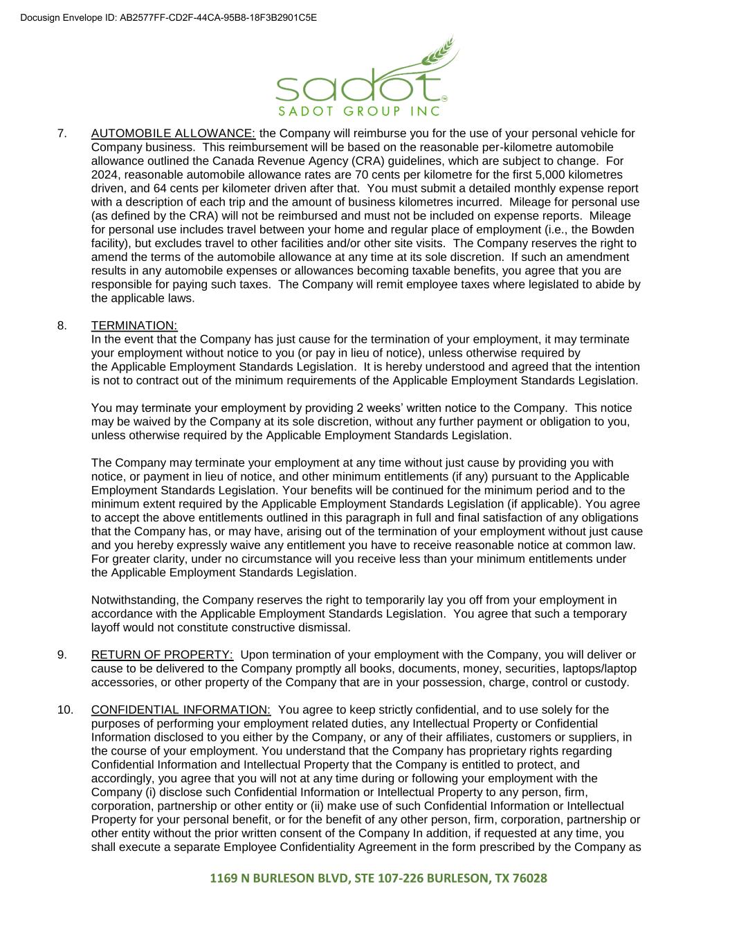 1169 N BURLESON BLVD, STE 107-226 BURLESON, TX 76028 7. AUTOMOBILE ALLOWANCE: the Company will reimburse you for the use of your personal vehicle for Company business. This reimbursement will be based on the reasonable per-kilometre automobile allowance outlined the Canada Revenue Agency (CRA) guidelines, which are subject to change. For 2024, reasonable automobile allowance rates are 70 cents per kilometre for the first 5,000 kilometres driven, and 64 cents per kilometer driven after that. You must submit a detailed monthly expense report with a description of each trip and the amount of business kilometres incurred. Mileage for personal use (as defined by the CRA) will not be reimbursed and must not be included on expense reports. Mileage for personal use includes travel between your home and regular place of employment (i.e., the Bowden facility), but excludes travel to other facilities and/or other site visits. The Company reserves the right to amend the terms of the automobile allowance at any time at its sole discretion. If such an amendment results in any automobile expenses or allowances becoming taxable benefits, you agree that you are responsible for paying such taxes. The Company will remit employee taxes where legislated to abide by the applicable laws. 8. TERMINATION: In the event that the Company has just cause for the termination of your employment, it may terminate your employment without notice to you (or pay in lieu of notice), unless otherwise required by the Applicable Employment Standards Legislation. It is hereby understood and agreed that the intention is not to contract out of the minimum requirements of the Applicable Employment Standards Legislation. You may terminate your employment by providing 2 weeks’ written notice to the Company. This notice may be waived by the Company at its sole discretion, without any further payment or obligation to you, unless otherwise required by the Applicable Employment Standards Legislation. The Company may terminate your employment at any time without just cause by providing you with notice, or payment in lieu of notice, and other minimum entitlements (if any) pursuant to the Applicable Employment Standards Legislation. Your benefits will be continued for the minimum period and to the minimum extent required by the Applicable Employment Standards Legislation (if applicable). You agree to accept the above entitlements outlined in this paragraph in full and final satisfaction of any obligations that the Company has, or may have, arising out of the termination of your employment without just cause and you hereby expressly waive any entitlement you have to receive reasonable notice at common law. For greater clarity, under no circumstance will you receive less than your minimum entitlements under the Applicable Employment Standards Legislation. Notwithstanding, the Company reserves the right to temporarily lay you off from your employment in accordance with the Applicable Employment Standards Legislation. You agree that such a temporary layoff would not constitute constructive dismissal. 9. RETURN OF PROPERTY: Upon termination of your employment with the Company, you will deliver or cause to be delivered to the Company promptly all books, documents, money, securities, laptops/laptop accessories, or other property of the Company that are in your possession, charge, control or custody. 10. CONFIDENTIAL INFORMATION: You agree to keep strictly confidential, and to use solely for the purposes of performing your employment related duties, any Intellectual Property or Confidential Information disclosed to you either by the Company, or any of their affiliates, customers or suppliers, in the course of your employment. You understand that the Company has proprietary rights regarding Confidential Information and Intellectual Property that the Company is entitled to protect, and accordingly, you agree that you will not at any time during or following your employment with the Company (i) disclose such Confidential Information or Intellectual Property to any person, firm, corporation, partnership or other entity or (ii) make use of such Confidential Information or Intellectual Property for your personal benefit, or for the benefit of any other person, firm, corporation, partnership or other entity without the prior written consent of the Company In addition, if requested at any time, you shall execute a separate Employee Confidentiality Agreement in the form prescribed by the Company as Docusign Envelope ID: AB2577FF-CD2F-44CA-95B8-18F3B2901C5E