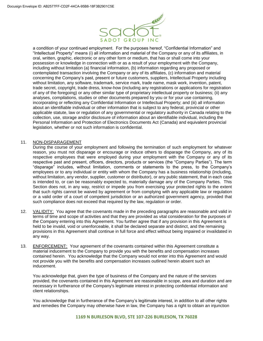 1169 N BURLESON BLVD, STE 107-226 BURLESON, TX 76028 a condition of your continued employment. For the purposes hereof, “Confidential Information” and “Intellectual Property” means (i) all information and material of the Company or any of its affiliates, in oral, written, graphic, electronic or any other form or medium, that has or shall come into your possession or knowledge in connection with or as a result of your employment with the Company, including without limitation (a) financial information, (b) information regarding any proposed or contemplated transaction involving the Company or any of its affiliates, (c) information and material concerning the Company’s past, present or future customers, suppliers, Intellectual Property including without limitation, any software, trademark, service mark, trade name, mask work, invention, patent, trade secret, copyright, trade dress, know-how (including any registrations or applications for registration of any of the foregoing) or any other similar type of proprietary intellectual property or business; (ii) any analyses, compilations, studies or other documents prepared by you or for your use containing, incorporating or reflecting any Confidential Information or Intellectual Property; and (iii) all information about an identifiable individual or other information that is subject to any federal, provincial or other applicable statute, law or regulation of any governmental or regulatory authority in Canada relating to the collection, use, storage and/or disclosure of information about an identifiable individual, including the Personal Information and Protection of Electronics Documents Act (Canada) and equivalent provincial legislation, whether or not such information is confidential. 11. NON-DISPARAGEMENT During the course of your employment and following the termination of such employment for whatever reason, you must not disparage or encourage or induce others to disparage the Company, any of its respective employees that were employed during your employment with the Company or any of its respective past and present, officers, directors, products or services (the “Company Parties”). The term “disparage” includes, without limitation, comments or statements to the press, to the Company’s employees or to any individual or entity with whom the Company has a business relationship (including, without limitation, any vendor, supplier, customer or distributor), or any public statement, that in each case is intended to, or can be reasonably expected to, materially damage any of the Company Parties. This Section does not, in any way, restrict or impede you from exercising your protected rights to the extent that such rights cannot be waived by agreement or from complying with any applicable law or regulation or a valid order of a court of competent jurisdiction or an authorized government agency, provided that such compliance does not exceed that required by the law, regulation or order. 12. VALIDITY: You agree that the covenants made in the preceding paragraphs are reasonable and valid in terms of time and scope of activities and that they are provided as vital consideration for the purposes of the Company entering into this Agreement. You further agree that if any provision in this Agreement is held to be invalid, void or unenforceable, it shall be declared separate and distinct, and the remaining provisions in this Agreement shall continue in full force and effect without being impaired or invalidated in any way. 13. ENFORCEMENT: Your agreement of the covenants contained within this Agreement constitute a material inducement to the Company to provide you with the benefits and compensation increases contained herein. You acknowledge that the Company would not enter into this Agreement and would not provide you with the benefits and compensation increases outlined herein absent such an inducement. You acknowledge that, given the type of business of the Company and the nature of the services provided, the covenants contained in this Agreement are reasonable in scope, area and duration and are necessary in furtherance of the Company's legitimate interest in protecting confidential information and client relationships. You acknowledge that in furtherance of the Company’s legitimate interest, in addition to all other rights and remedies the Company may otherwise have in law, the Company has a right to obtain an injunction Docusign Envelope ID: AB2577FF-CD2F-44CA-95B8-18F3B2901C5E