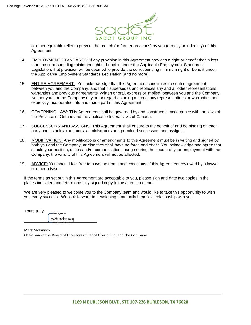 1169 N BURLESON BLVD, STE 107-226 BURLESON, TX 76028 or other equitable relief to prevent the breach (or further breaches) by you (directly or indirectly) of this Agreement. 14. EMPLOYMENT STANDARDS: If any provision in this Agreement provides a right or benefit that is less than the corresponding minimum right or benefits under the Applicable Employment Standards Legislation, that provision will be deemed to provide the corresponding minimum right or benefit under the Applicable Employment Standards Legislation (and no more). 15. ENTIRE AGREEMENT: You acknowledge that this Agreement constitutes the entire agreement between you and the Company, and that it supersedes and replaces any and all other representations, warranties and previous agreements, written or oral, express or implied, between you and the Company. Neither you nor the Company rely on or regard as being material any representations or warranties not expressly incorporated into and made part of this Agreement. 16. GOVERNING LAW: This Agreement shall be governed by and construed in accordance with the laws of the Province of Ontario and the applicable federal laws of Canada. 17. SUCCESSORS AND ASSIGNS: This Agreement shall ensure to the benefit of and be binding on each party and its heirs, executors, administrators and permitted successors and assigns. 18. MODIFICATION: Any modifications or amendments to this Agreement must be in writing and signed by both you and the Company, or else they shall have no force and effect. You acknowledge and agree that should your position, duties and/or compensation change during the course of your employment with the Company, the validity of this Agreement will not be affected. 19. ADVICE: You should feel free to have the terms and conditions of this Agreement reviewed by a lawyer or other advisor. If the terms as set out in this Agreement are acceptable to you, please sign and date two copies in the places indicated and return one fully signed copy to the attention of me. We are very pleased to welcome you to the Company team and would like to take this opportunity to wish you every success. We look forward to developing a mutually beneficial relationship with you. Yours truly, ________________________________ Mark McKinney Chairman of the Board of Directors of Sadot Group, Inc. and the Company Docusign Envelope ID: AB2577FF-CD2F-44CA-95B8-18F3B2901C5E
