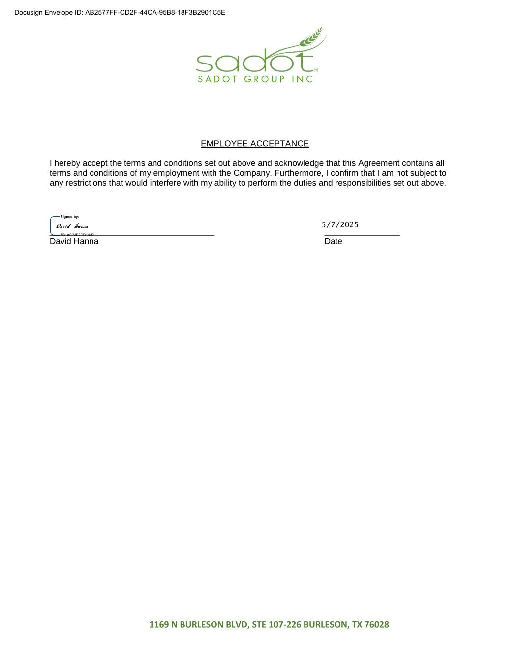 1169 N BURLESON BLVD, STE 107-226 BURLESON, TX 76028 EMPLOYEE ACCEPTANCE I hereby accept the terms and conditions set out above and acknowledge that this Agreement contains all terms and conditions of my employment with the Company. Furthermore, I confirm that I am not subject to any restrictions that would interfere with my ability to perform the duties and responsibilities set out above. ___________________________________ ________________ David Hanna Date Docusign Envelope ID: AB2577FF-CD2F-44CA-95B8-18F3B2901C5E 5/7/2025