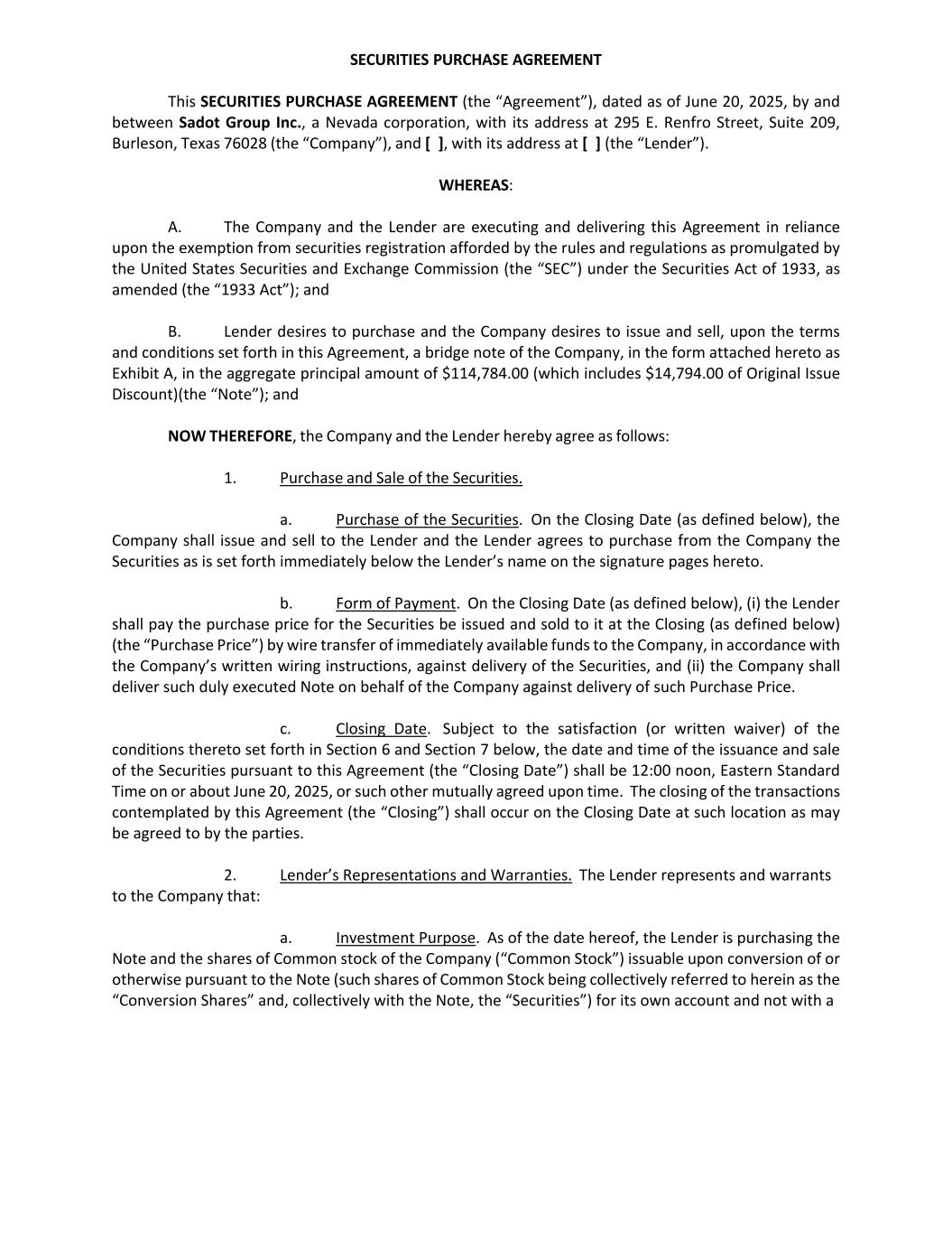 SECURITIES PURCHASE AGREEMENT This SECURITIES PURCHASE AGREEMENT (the “Agreement”), dated as of June 20, 2025, by and between Sadot Group Inc., a Nevada corporation, with its address at 295 E. Renfro Street, Suite 209, Burleson, Texas 76028 (the “Company”), and [ ], with its address at [ ] (the “Lender”). WHEREAS: A. The Company and the Lender are executing and delivering this Agreement in reliance upon the exemption from securities registration afforded by the rules and regulations as promulgated by the United States Securities and Exchange Commission (the “SEC”) under the Securities Act of 1933, as amended (the “1933 Act”); and B. Lender desires to purchase and the Company desires to issue and sell, upon the terms and conditions set forth in this Agreement, a bridge note of the Company, in the form attached hereto as Exhibit A, in the aggregate principal amount of $114,784.00 (which includes $14,794.00 of Original Issue Discount)(the “Note”); and NOW THEREFORE, the Company and the Lender hereby agree as follows: 1. Purchase and Sale of the Securities. a. Purchase of the Securities. On the Closing Date (as defined below), the Company shall issue and sell to the Lender and the Lender agrees to purchase from the Company the Securities as is set forth immediately below the Lender’s name on the signature pages hereto. b. Form of Payment. On the Closing Date (as defined below), (i) the Lender shall pay the purchase price for the Securities be issued and sold to it at the Closing (as defined below) (the “Purchase Price”) by wire transfer of immediately available funds to the Company, in accordance with the Company’s written wiring instructions, against delivery of the Securities, and (ii) the Company shall deliver such duly executed Note on behalf of the Company against delivery of such Purchase Price. c. Closing Date. Subject to the satisfaction (or written waiver) of the conditions thereto set forth in Section 6 and Section 7 below, the date and time of the issuance and sale of the Securities pursuant to this Agreement (the “Closing Date”) shall be 12:00 noon, Eastern Standard Time on or about June 20, 2025, or such other mutually agreed upon time. The closing of the transactions contemplated by this Agreement (the “Closing”) shall occur on the Closing Date at such location as may be agreed to by the parties. 2. Lender’s Representations and Warranties. The Lender represents and warrants to the Company that: a. Investment Purpose. As of the date hereof, the Lender is purchasing the Note and the shares of Common stock of the Company (“Common Stock”) issuable upon conversion of or otherwise pursuant to the Note (such shares of Common Stock being collectively referred to herein as the “Conversion Shares” and, collectively with the Note, the “Securities”) for its own account and not with a