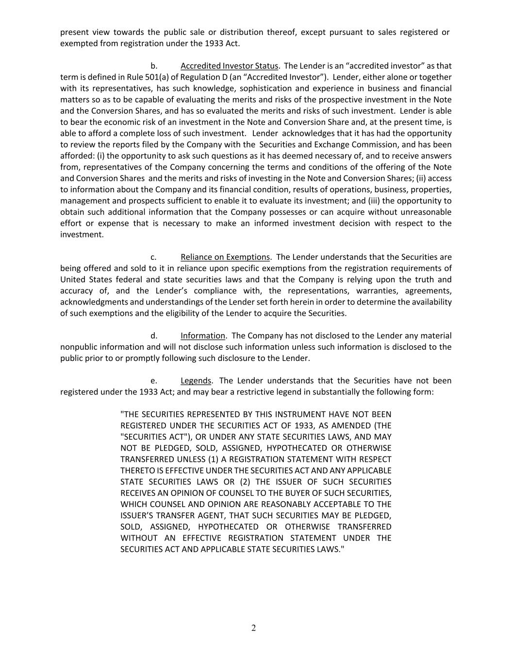 2 present view towards the public sale or distribution thereof, except pursuant to sales registered or exempted from registration under the 1933 Act. b. Accredited Investor Status. The Lender is an “accredited investor” as that term is defined in Rule 501(a) of Regulation D (an “Accredited Investor”). Lender, either alone or together with its representatives, has such knowledge, sophistication and experience in business and financial matters so as to be capable of evaluating the merits and risks of the prospective investment in the Note and the Conversion Shares, and has so evaluated the merits and risks of such investment. Lender is able to bear the economic risk of an investment in the Note and Conversion Share and, at the present time, is able to afford a complete loss of such investment. Lender acknowledges that it has had the opportunity to review the reports filed by the Company with the Securities and Exchange Commission, and has been afforded: (i) the opportunity to ask such questions as it has deemed necessary of, and to receive answers from, representatives of the Company concerning the terms and conditions of the offering of the Note and Conversion Shares and the merits and risks of investing in the Note and Conversion Shares; (ii) access to information about the Company and its financial condition, results of operations, business, properties, management and prospects sufficient to enable it to evaluate its investment; and (iii) the opportunity to obtain such additional information that the Company possesses or can acquire without unreasonable effort or expense that is necessary to make an informed investment decision with respect to the investment. c. Reliance on Exemptions. The Lender understands that the Securities are being offered and sold to it in reliance upon specific exemptions from the registration requirements of United States federal and state securities laws and that the Company is relying upon the truth and accuracy of, and the Lender’s compliance with, the representations, warranties, agreements, acknowledgments and understandings of the Lender set forth herein in order to determine the availability of such exemptions and the eligibility of the Lender to acquire the Securities. d. Information. The Company has not disclosed to the Lender any material nonpublic information and will not disclose such information unless such information is disclosed to the public prior to or promptly following such disclosure to the Lender. e. Legends. The Lender understands that the Securities have not been registered under the 1933 Act; and may bear a restrictive legend in substantially the following form: "THE SECURITIES REPRESENTED BY THIS INSTRUMENT HAVE NOT BEEN REGISTERED UNDER THE SECURITIES ACT OF 1933, AS AMENDED (THE "SECURITIES ACT"), OR UNDER ANY STATE SECURITIES LAWS, AND MAY NOT BE PLEDGED, SOLD, ASSIGNED, HYPOTHECATED OR OTHERWISE TRANSFERRED UNLESS (1) A REGISTRATION STATEMENT WITH RESPECT THERETO IS EFFECTIVE UNDER THE SECURITIES ACT AND ANY APPLICABLE STATE SECURITIES LAWS OR (2) THE ISSUER OF SUCH SECURITIES RECEIVES AN OPINION OF COUNSEL TO THE BUYER OF SUCH SECURITIES, WHICH COUNSEL AND OPINION ARE REASONABLY ACCEPTABLE TO THE ISSUER’S TRANSFER AGENT, THAT SUCH SECURITIES MAY BE PLEDGED, SOLD, ASSIGNED, HYPOTHECATED OR OTHERWISE TRANSFERRED WITHOUT AN EFFECTIVE REGISTRATION STATEMENT UNDER THE SECURITIES ACT AND APPLICABLE STATE SECURITIES LAWS."