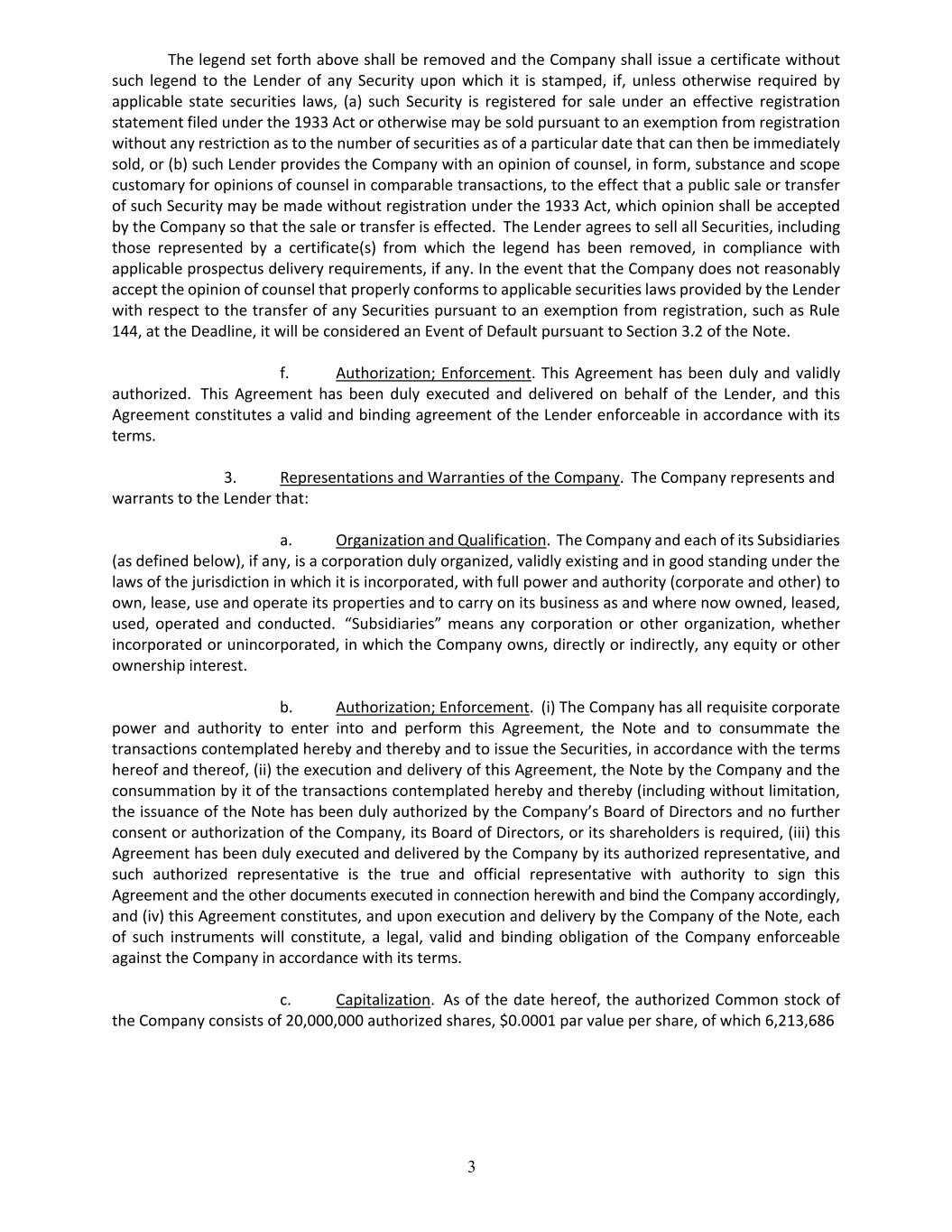 3 The legend set forth above shall be removed and the Company shall issue a certificate without such legend to the Lender of any Security upon which it is stamped, if, unless otherwise required by applicable state securities laws, (a) such Security is registered for sale under an effective registration statement filed under the 1933 Act or otherwise may be sold pursuant to an exemption from registration without any restriction as to the number of securities as of a particular date that can then be immediately sold, or (b) such Lender provides the Company with an opinion of counsel, in form, substance and scope customary for opinions of counsel in comparable transactions, to the effect that a public sale or transfer of such Security may be made without registration under the 1933 Act, which opinion shall be accepted by the Company so that the sale or transfer is effected. The Lender agrees to sell all Securities, including those represented by a certificate(s) from which the legend has been removed, in compliance with applicable prospectus delivery requirements, if any. In the event that the Company does not reasonably accept the opinion of counsel that properly conforms to applicable securities laws provided by the Lender with respect to the transfer of any Securities pursuant to an exemption from registration, such as Rule 144, at the Deadline, it will be considered an Event of Default pursuant to Section 3.2 of the Note. f. Authorization; Enforcement. This Agreement has been duly and validly authorized. This Agreement has been duly executed and delivered on behalf of the Lender, and this Agreement constitutes a valid and binding agreement of the Lender enforceable in accordance with its terms. 3. Representations and Warranties of the Company. The Company represents and warrants to the Lender that: a. Organization and Qualification. The Company and each of its Subsidiaries (as defined below), if any, is a corporation duly organized, validly existing and in good standing under the laws of the jurisdiction in which it is incorporated, with full power and authority (corporate and other) to own, lease, use and operate its properties and to carry on its business as and where now owned, leased, used, operated and conducted. “Subsidiaries” means any corporation or other organization, whether incorporated or unincorporated, in which the Company owns, directly or indirectly, any equity or other ownership interest. b. Authorization; Enforcement. (i) The Company has all requisite corporate power and authority to enter into and perform this Agreement, the Note and to consummate the transactions contemplated hereby and thereby and to issue the Securities, in accordance with the terms hereof and thereof, (ii) the execution and delivery of this Agreement, the Note by the Company and the consummation by it of the transactions contemplated hereby and thereby (including without limitation, the issuance of the Note has been duly authorized by the Company’s Board of Directors and no further consent or authorization of the Company, its Board of Directors, or its shareholders is required, (iii) this Agreement has been duly executed and delivered by the Company by its authorized representative, and such authorized representative is the true and official representative with authority to sign this Agreement and the other documents executed in connection herewith and bind the Company accordingly, and (iv) this Agreement constitutes, and upon execution and delivery by the Company of the Note, each of such instruments will constitute, a legal, valid and binding obligation of the Company enforceable against the Company in accordance with its terms. c. Capitalization. As of the date hereof, the authorized Common stock of the Company consists of 20,000,000 authorized shares, $0.0001 par value per share, of which 6,213,686