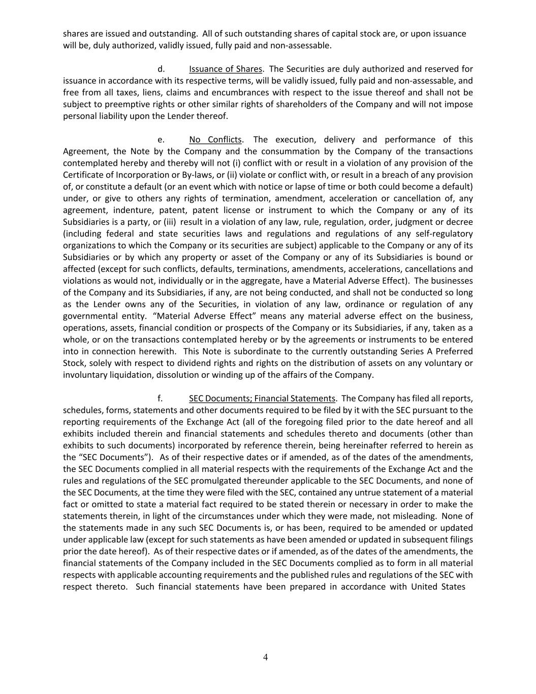 4 shares are issued and outstanding. All of such outstanding shares of capital stock are, or upon issuance will be, duly authorized, validly issued, fully paid and non-assessable. d. Issuance of Shares. The Securities are duly authorized and reserved for issuance in accordance with its respective terms, will be validly issued, fully paid and non-assessable, and free from all taxes, liens, claims and encumbrances with respect to the issue thereof and shall not be subject to preemptive rights or other similar rights of shareholders of the Company and will not impose personal liability upon the Lender thereof. e. No Conflicts. The execution, delivery and performance of this Agreement, the Note by the Company and the consummation by the Company of the transactions contemplated hereby and thereby will not (i) conflict with or result in a violation of any provision of the Certificate of Incorporation or By-laws, or (ii) violate or conflict with, or result in a breach of any provision of, or constitute a default (or an event which with notice or lapse of time or both could become a default) under, or give to others any rights of termination, amendment, acceleration or cancellation of, any agreement, indenture, patent, patent license or instrument to which the Company or any of its Subsidiaries is a party, or (iii) result in a violation of any law, rule, regulation, order, judgment or decree (including federal and state securities laws and regulations and regulations of any self-regulatory organizations to which the Company or its securities are subject) applicable to the Company or any of its Subsidiaries or by which any property or asset of the Company or any of its Subsidiaries is bound or affected (except for such conflicts, defaults, terminations, amendments, accelerations, cancellations and violations as would not, individually or in the aggregate, have a Material Adverse Effect). The businesses of the Company and its Subsidiaries, if any, are not being conducted, and shall not be conducted so long as the Lender owns any of the Securities, in violation of any law, ordinance or regulation of any governmental entity. “Material Adverse Effect” means any material adverse effect on the business, operations, assets, financial condition or prospects of the Company or its Subsidiaries, if any, taken as a whole, or on the transactions contemplated hereby or by the agreements or instruments to be entered into in connection herewith. This Note is subordinate to the currently outstanding Series A Preferred Stock, solely with respect to dividend rights and rights on the distribution of assets on any voluntary or involuntary liquidation, dissolution or winding up of the affairs of the Company. f. SEC Documents; Financial Statements. The Company has filed all reports, schedules, forms, statements and other documents required to be filed by it with the SEC pursuant to the reporting requirements of the Exchange Act (all of the foregoing filed prior to the date hereof and all exhibits included therein and financial statements and schedules thereto and documents (other than exhibits to such documents) incorporated by reference therein, being hereinafter referred to herein as the “SEC Documents”). As of their respective dates or if amended, as of the dates of the amendments, the SEC Documents complied in all material respects with the requirements of the Exchange Act and the rules and regulations of the SEC promulgated thereunder applicable to the SEC Documents, and none of the SEC Documents, at the time they were filed with the SEC, contained any untrue statement of a material fact or omitted to state a material fact required to be stated therein or necessary in order to make the statements therein, in light of the circumstances under which they were made, not misleading. None of the statements made in any such SEC Documents is, or has been, required to be amended or updated under applicable law (except for such statements as have been amended or updated in subsequent filings prior the date hereof). As of their respective dates or if amended, as of the dates of the amendments, the financial statements of the Company included in the SEC Documents complied as to form in all material respects with applicable accounting requirements and the published rules and regulations of the SEC with respect thereto. Such financial statements have been prepared in accordance with United States