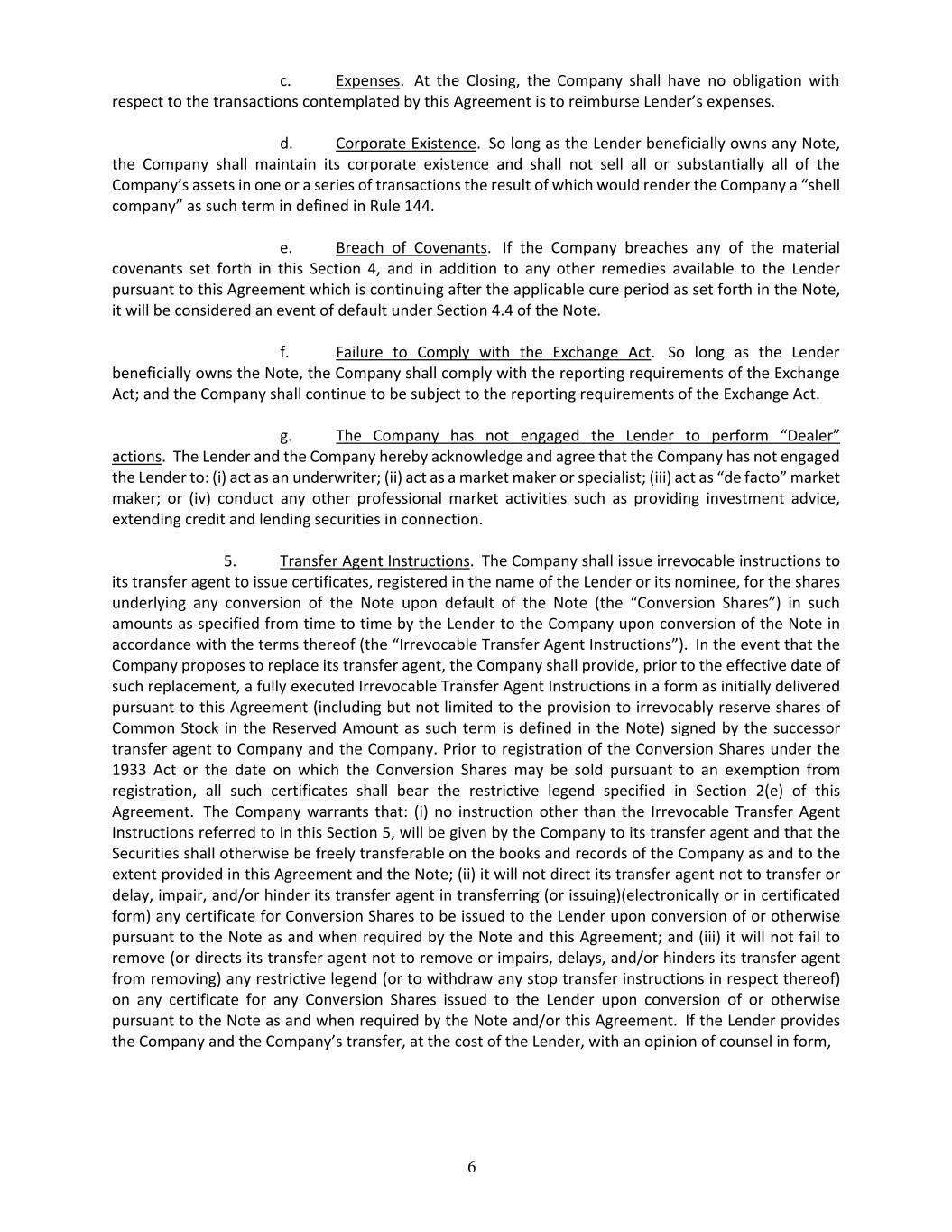 6 c. Expenses. At the Closing, the Company shall have no obligation with respect to the transactions contemplated by this Agreement is to reimburse Lender’s expenses. d. Corporate Existence. So long as the Lender beneficially owns any Note, the Company shall maintain its corporate existence and shall not sell all or substantially all of the Company’s assets in one or a series of transactions the result of which would render the Company a “shell company” as such term in defined in Rule 144. e. Breach of Covenants. If the Company breaches any of the material covenants set forth in this Section 4, and in addition to any other remedies available to the Lender pursuant to this Agreement which is continuing after the applicable cure period as set forth in the Note, it will be considered an event of default under Section 4.4 of the Note. f. Failure to Comply with the Exchange Act. So long as the Lender beneficially owns the Note, the Company shall comply with the reporting requirements of the Exchange Act; and the Company shall continue to be subject to the reporting requirements of the Exchange Act. g. The Company has not engaged the Lender to perform “Dealer” actions. The Lender and the Company hereby acknowledge and agree that the Company has not engaged the Lender to: (i) act as an underwriter; (ii) act as a market maker or specialist; (iii) act as “de facto” market maker; or (iv) conduct any other professional market activities such as providing investment advice, extending credit and lending securities in connection. 5. Transfer Agent Instructions. The Company shall issue irrevocable instructions to its transfer agent to issue certificates, registered in the name of the Lender or its nominee, for the shares underlying any conversion of the Note upon default of the Note (the “Conversion Shares”) in such amounts as specified from time to time by the Lender to the Company upon conversion of the Note in accordance with the terms thereof (the “Irrevocable Transfer Agent Instructions”). In the event that the Company proposes to replace its transfer agent, the Company shall provide, prior to the effective date of such replacement, a fully executed Irrevocable Transfer Agent Instructions in a form as initially delivered pursuant to this Agreement (including but not limited to the provision to irrevocably reserve shares of Common Stock in the Reserved Amount as such term is defined in the Note) signed by the successor transfer agent to Company and the Company. Prior to registration of the Conversion Shares under the 1933 Act or the date on which the Conversion Shares may be sold pursuant to an exemption from registration, all such certificates shall bear the restrictive legend specified in Section 2(e) of this Agreement. The Company warrants that: (i) no instruction other than the Irrevocable Transfer Agent Instructions referred to in this Section 5, will be given by the Company to its transfer agent and that the Securities shall otherwise be freely transferable on the books and records of the Company as and to the extent provided in this Agreement and the Note; (ii) it will not direct its transfer agent not to transfer or delay, impair, and/or hinder its transfer agent in transferring (or issuing)(electronically or in certificated form) any certificate for Conversion Shares to be issued to the Lender upon conversion of or otherwise pursuant to the Note as and when required by the Note and this Agreement; and (iii) it will not fail to remove (or directs its transfer agent not to remove or impairs, delays, and/or hinders its transfer agent from removing) any restrictive legend (or to withdraw any stop transfer instructions in respect thereof) on any certificate for any Conversion Shares issued to the Lender upon conversion of or otherwise pursuant to the Note as and when required by the Note and/or this Agreement. If the Lender provides the Company and the Company’s transfer, at the cost of the Lender, with an opinion of counsel in form,