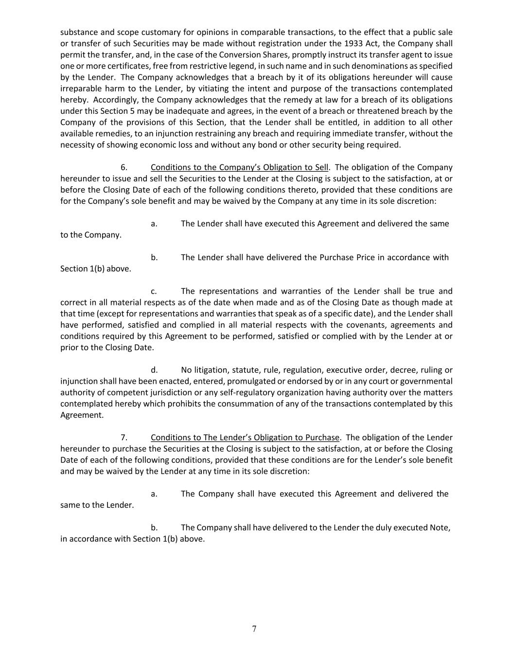 7 substance and scope customary for opinions in comparable transactions, to the effect that a public sale or transfer of such Securities may be made without registration under the 1933 Act, the Company shall permit the transfer, and, in the case of the Conversion Shares, promptly instruct its transfer agent to issue one or more certificates, free from restrictive legend, in such name and in such denominations as specified by the Lender. The Company acknowledges that a breach by it of its obligations hereunder will cause irreparable harm to the Lender, by vitiating the intent and purpose of the transactions contemplated hereby. Accordingly, the Company acknowledges that the remedy at law for a breach of its obligations under this Section 5 may be inadequate and agrees, in the event of a breach or threatened breach by the Company of the provisions of this Section, that the Lender shall be entitled, in addition to all other available remedies, to an injunction restraining any breach and requiring immediate transfer, without the necessity of showing economic loss and without any bond or other security being required. 6. Conditions to the Company’s Obligation to Sell. The obligation of the Company hereunder to issue and sell the Securities to the Lender at the Closing is subject to the satisfaction, at or before the Closing Date of each of the following conditions thereto, provided that these conditions are for the Company’s sole benefit and may be waived by the Company at any time in its sole discretion: a. The Lender shall have executed this Agreement and delivered the same to the Company. b. The Lender shall have delivered the Purchase Price in accordance with Section 1(b) above. c. The representations and warranties of the Lender shall be true and correct in all material respects as of the date when made and as of the Closing Date as though made at that time (except for representations and warranties that speak as of a specific date), and the Lender shall have performed, satisfied and complied in all material respects with the covenants, agreements and conditions required by this Agreement to be performed, satisfied or complied with by the Lender at or prior to the Closing Date. d. No litigation, statute, rule, regulation, executive order, decree, ruling or injunction shall have been enacted, entered, promulgated or endorsed by or in any court or governmental authority of competent jurisdiction or any self-regulatory organization having authority over the matters contemplated hereby which prohibits the consummation of any of the transactions contemplated by this Agreement. 7. Conditions to The Lender’s Obligation to Purchase. The obligation of the Lender hereunder to purchase the Securities at the Closing is subject to the satisfaction, at or before the Closing Date of each of the following conditions, provided that these conditions are for the Lender’s sole benefit and may be waived by the Lender at any time in its sole discretion: a. The Company shall have executed this Agreement and delivered the same to the Lender. b. The Company shall have delivered to the Lender the duly executed Note, in accordance with Section 1(b) above.