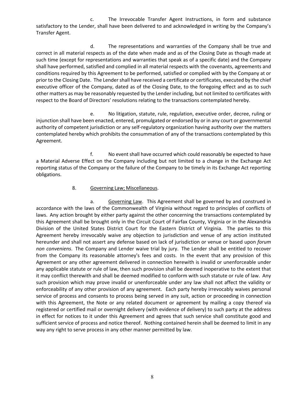 8 c. The Irrevocable Transfer Agent Instructions, in form and substance satisfactory to the Lender, shall have been delivered to and acknowledged in writing by the Company’s Transfer Agent. d. The representations and warranties of the Company shall be true and correct in all material respects as of the date when made and as of the Closing Date as though made at such time (except for representations and warranties that speak as of a specific date) and the Company shall have performed, satisfied and complied in all material respects with the covenants, agreements and conditions required by this Agreement to be performed, satisfied or complied with by the Company at or prior to the Closing Date. The Lender shall have received a certificate or certificates, executed by the chief executive officer of the Company, dated as of the Closing Date, to the foregoing effect and as to such other matters as may be reasonably requested by the Lender including, but not limited to certificates with respect to the Board of Directors’ resolutions relating to the transactions contemplated hereby. e. No litigation, statute, rule, regulation, executive order, decree, ruling or injunction shall have been enacted, entered, promulgated or endorsed by or in any court or governmental authority of competent jurisdiction or any self-regulatory organization having authority over the matters contemplated hereby which prohibits the consummation of any of the transactions contemplated by this Agreement. f. No event shall have occurred which could reasonably be expected to have a Material Adverse Effect on the Company including but not limited to a change in the Exchange Act reporting status of the Company or the failure of the Company to be timely in its Exchange Act reporting obligations. 8. Governing Law; Miscellaneous. a. Governing Law. This Agreement shall be governed by and construed in accordance with the laws of the Commonwealth of Virginia without regard to principles of conflicts of laws. Any action brought by either party against the other concerning the transactions contemplated by this Agreement shall be brought only in the Circuit Court of Fairfax County, Virginia or in the Alexandria Division of the United States District Court for the Eastern District of Virginia. The parties to this Agreement hereby irrevocably waive any objection to jurisdiction and venue of any action instituted hereunder and shall not assert any defense based on lack of jurisdiction or venue or based upon forum non conveniens. The Company and Lender waive trial by jury. The Lender shall be entitled to recover from the Company its reasonable attorney's fees and costs. In the event that any provision of this Agreement or any other agreement delivered in connection herewith is invalid or unenforceable under any applicable statute or rule of law, then such provision shall be deemed inoperative to the extent that it may conflict therewith and shall be deemed modified to conform with such statute or rule of law. Any such provision which may prove invalid or unenforceable under any law shall not affect the validity or enforceability of any other provision of any agreement. Each party hereby irrevocably waives personal service of process and consents to process being served in any suit, action or proceeding in connection with this Agreement, the Note or any related document or agreement by mailing a copy thereof via registered or certified mail or overnight delivery (with evidence of delivery) to such party at the address in effect for notices to it under this Agreement and agrees that such service shall constitute good and sufficient service of process and notice thereof. Nothing contained herein shall be deemed to limit in any way any right to serve process in any other manner permitted by law.