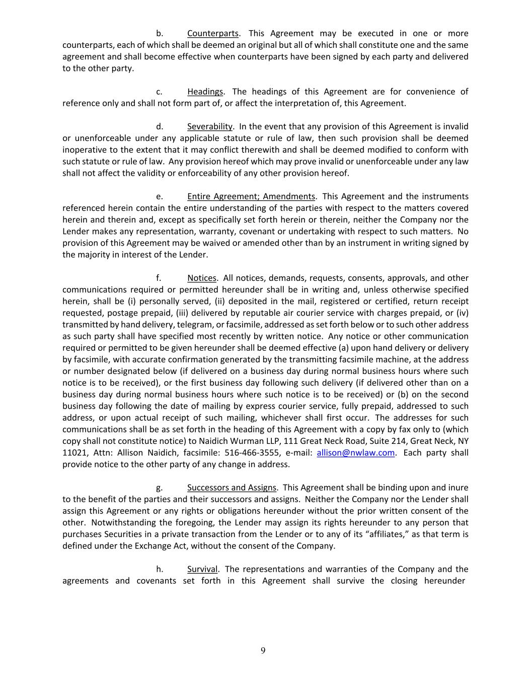9 b. Counterparts. This Agreement may be executed in one or more counterparts, each of which shall be deemed an original but all of which shall constitute one and the same agreement and shall become effective when counterparts have been signed by each party and delivered to the other party. c. Headings. The headings of this Agreement are for convenience of reference only and shall not form part of, or affect the interpretation of, this Agreement. d. Severability. In the event that any provision of this Agreement is invalid or unenforceable under any applicable statute or rule of law, then such provision shall be deemed inoperative to the extent that it may conflict therewith and shall be deemed modified to conform with such statute or rule of law. Any provision hereof which may prove invalid or unenforceable under any law shall not affect the validity or enforceability of any other provision hereof. e. Entire Agreement; Amendments. This Agreement and the instruments referenced herein contain the entire understanding of the parties with respect to the matters covered herein and therein and, except as specifically set forth herein or therein, neither the Company nor the Lender makes any representation, warranty, covenant or undertaking with respect to such matters. No provision of this Agreement may be waived or amended other than by an instrument in writing signed by the majority in interest of the Lender. f. Notices. All notices, demands, requests, consents, approvals, and other communications required or permitted hereunder shall be in writing and, unless otherwise specified herein, shall be (i) personally served, (ii) deposited in the mail, registered or certified, return receipt requested, postage prepaid, (iii) delivered by reputable air courier service with charges prepaid, or (iv) transmitted by hand delivery, telegram, or facsimile, addressed as set forth below or to such other address as such party shall have specified most recently by written notice. Any notice or other communication required or permitted to be given hereunder shall be deemed effective (a) upon hand delivery or delivery by facsimile, with accurate confirmation generated by the transmitting facsimile machine, at the address or number designated below (if delivered on a business day during normal business hours where such notice is to be received), or the first business day following such delivery (if delivered other than on a business day during normal business hours where such notice is to be received) or (b) on the second business day following the date of mailing by express courier service, fully prepaid, addressed to such address, or upon actual receipt of such mailing, whichever shall first occur. The addresses for such communications shall be as set forth in the heading of this Agreement with a copy by fax only to (which copy shall not constitute notice) to Naidich Wurman LLP, 111 Great Neck Road, Suite 214, Great Neck, NY 11021, Attn: Allison Naidich, facsimile: 516-466-3555, e-mail: allison@nwlaw.com. Each party shall provide notice to the other party of any change in address. g. Successors and Assigns. This Agreement shall be binding upon and inure to the benefit of the parties and their successors and assigns. Neither the Company nor the Lender shall assign this Agreement or any rights or obligations hereunder without the prior written consent of the other. Notwithstanding the foregoing, the Lender may assign its rights hereunder to any person that purchases Securities in a private transaction from the Lender or to any of its “affiliates,” as that term is defined under the Exchange Act, without the consent of the Company. h. Survival. The representations and warranties of the Company and the agreements and covenants set forth in this Agreement shall survive the closing hereunder