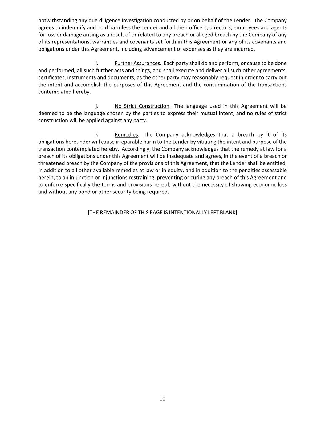 10 notwithstanding any due diligence investigation conducted by or on behalf of the Lender. The Company agrees to indemnify and hold harmless the Lender and all their officers, directors, employees and agents for loss or damage arising as a result of or related to any breach or alleged breach by the Company of any of its representations, warranties and covenants set forth in this Agreement or any of its covenants and obligations under this Agreement, including advancement of expenses as they are incurred. i. Further Assurances. Each party shall do and perform, or cause to be done and performed, all such further acts and things, and shall execute and deliver all such other agreements, certificates, instruments and documents, as the other party may reasonably request in order to carry out the intent and accomplish the purposes of this Agreement and the consummation of the transactions contemplated hereby. j. No Strict Construction. The language used in this Agreement will be deemed to be the language chosen by the parties to express their mutual intent, and no rules of strict construction will be applied against any party. k. Remedies. The Company acknowledges that a breach by it of its obligations hereunder will cause irreparable harm to the Lender by vitiating the intent and purpose of the transaction contemplated hereby. Accordingly, the Company acknowledges that the remedy at law for a breach of its obligations under this Agreement will be inadequate and agrees, in the event of a breach or threatened breach by the Company of the provisions of this Agreement, that the Lender shall be entitled, in addition to all other available remedies at law or in equity, and in addition to the penalties assessable herein, to an injunction or injunctions restraining, preventing or curing any breach of this Agreement and to enforce specifically the terms and provisions hereof, without the necessity of showing economic loss and without any bond or other security being required. [THE REMAINDER OF THIS PAGE IS INTENTIONALLY LEFT BLANK]