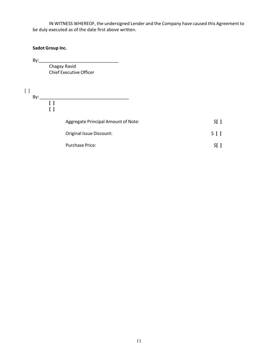 11 IN WITNESS WHEREOF, the undersigned Lender and the Company have caused this Agreement to be duly executed as of the date first above written. Sadot Group Inc. By: Chagay Ravid Chief Executive Officer [ ] By: [ ] [ ] Aggregate Principal Amount of Note: $[ ] Original Issue Discount: $ [ ] Purchase Price: $[ ]