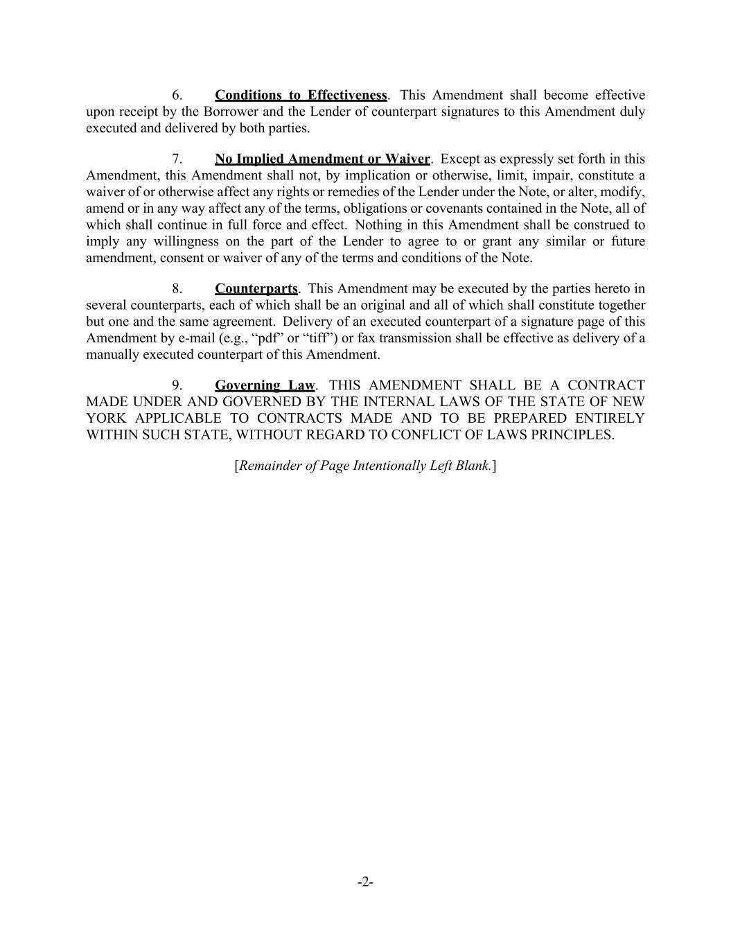 -2- 6. Conditions to Effectiveness. This Amendment shall become effective upon receipt by the Borrower and the Lender of counterpart signatures to this Amendment duly executed and delivered by both parties. 7. No Implied Amendment or Waiver. Except as expressly set forth in this Amendment, this Amendment shall not, by implication or otherwise, limit, impair, constitute a waiver of or otherwise affect any rights or remedies of the Lender under the Note, or alter, modify, amend or in any way affect any of the terms, obligations or covenants contained in the Note, all of which shall continue in full force and effect. Nothing in this Amendment shall be construed to imply any willingness on the part of the Lender to agree to or grant any similar or future amendment, consent or waiver of any of the terms and conditions of the Note. 8. Counterparts. This Amendment may be executed by the parties hereto in several counterparts, each of which shall be an original and all of which shall constitute together but one and the same agreement. Delivery of an executed counterpart of a signature page of this Amendment by e-mail (e.g., “pdf” or “tiff”) or fax transmission shall be effective as delivery of a manually executed counterpart of this Amendment. 9. Governing Law. THIS AMENDMENT SHALL BE A CONTRACT MADE UNDER AND GOVERNED BY THE INTERNAL LAWS OF THE STATE OF NEW YORK APPLICABLE TO CONTRACTS MADE AND TO BE PREPARED ENTIRELY WITHIN SUCH STATE, WITHOUT REGARD TO CONFLICT OF LAWS PRINCIPLES. [Remainder of Page Intentionally Left Blank.]