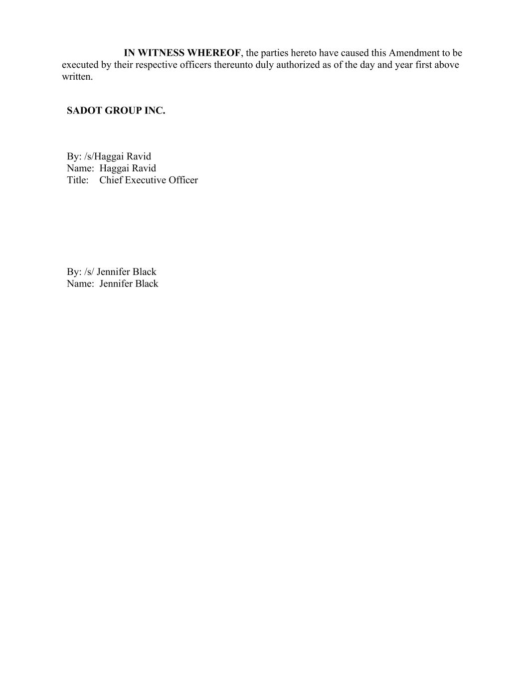 IN WITNESS WHEREOF, the parties hereto have caused this Amendment to be executed by their respective officers thereunto duly authorized as of the day and year first above written. SADOT GROUP INC. By: /s/Haggai Ravid Name: Haggai Ravid Title: Chief Executive Officer By: /s/ Jennifer Black Name: Jennifer Black