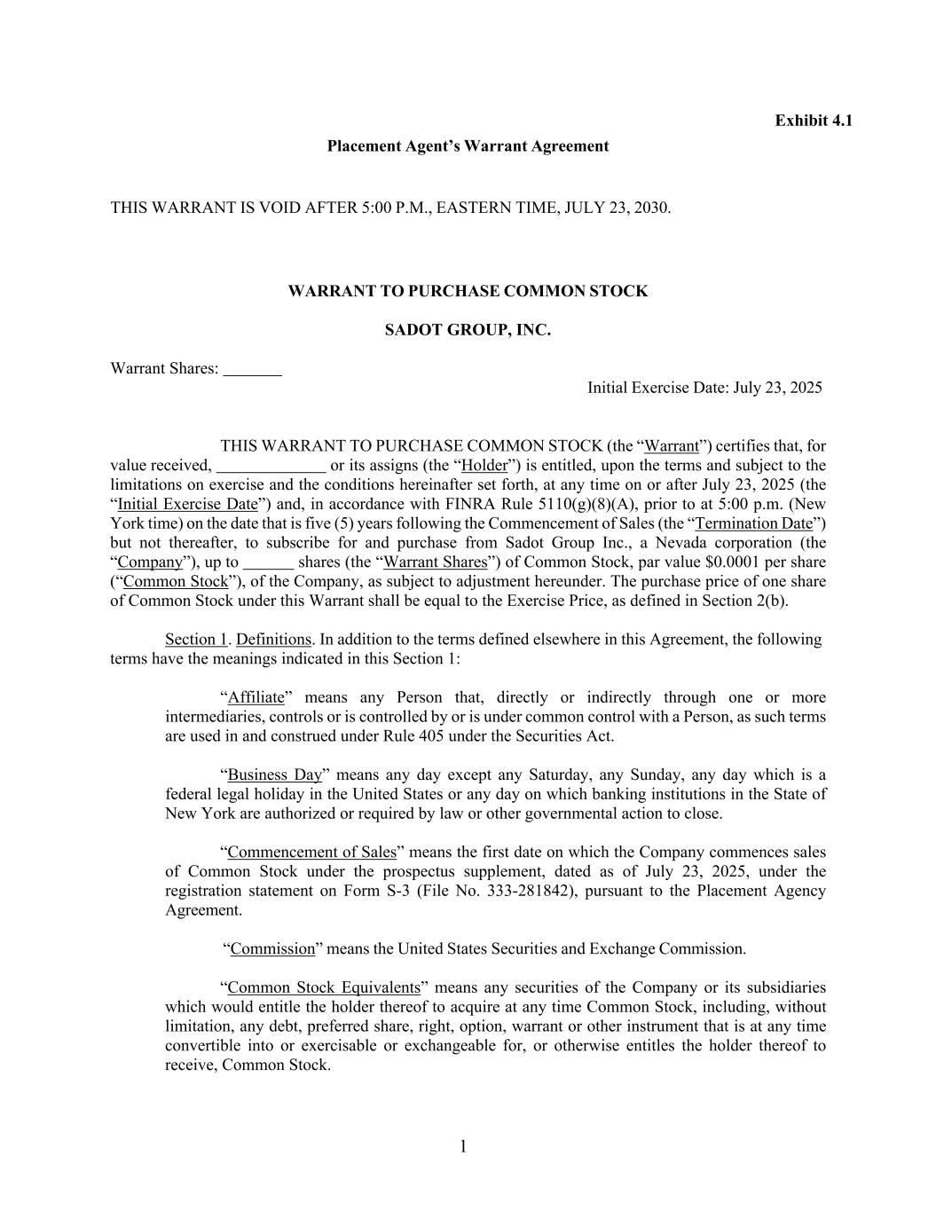 1 Exhibit 4.1 Placement Agent’s Warrant Agreement THIS WARRANT IS VOID AFTER 5:00 P.M., EASTERN TIME, JULY 23, 2030. WARRANT TO PURCHASE COMMON STOCK SADOT GROUP, INC. Warrant Shares: Initial Exercise Date: July 23, 2025 THIS WARRANT TO PURCHASE COMMON STOCK (the “Warrant”) certifies that, for value received, or its assigns (the “Holder”) is entitled, upon the terms and subject to the limitations on exercise and the conditions hereinafter set forth, at any time on or after July 23, 2025 (the “Initial Exercise Date”) and, in accordance with FINRA Rule 5110(g)(8)(A), prior to at 5:00 p.m. (New York time) on the date that is five (5) years following the Commencement of Sales (the “Termination Date”) but not thereafter, to subscribe for and purchase from Sadot Group Inc., a Nevada corporation (the “Company”), up to shares (the “Warrant Shares”) of Common Stock, par value $0.0001 per share (“Common Stock”), of the Company, as subject to adjustment hereunder. The purchase price of one share of Common Stock under this Warrant shall be equal to the Exercise Price, as defined in Section 2(b). Section 1. Definitions. In addition to the terms defined elsewhere in this Agreement, the following terms have the meanings indicated in this Section 1: “Affiliate” means any Person that, directly or indirectly through one or more intermediaries, controls or is controlled by or is under common control with a Person, as such terms are used in and construed under Rule 405 under the Securities Act. “Business Day” means any day except any Saturday, any Sunday, any day which is a federal legal holiday in the United States or any day on which banking institutions in the State of New York are authorized or required by law or other governmental action to close. “Commencement of Sales” means the first date on which the Company commences sales of Common Stock under the prospectus supplement, dated as of July 23, 2025, under the registration statement on Form S-3 (File No. 333-281842), pursuant to the Placement Agency Agreement. “Commission” means the United States Securities and Exchange Commission. “Common Stock Equivalents” means any securities of the Company or its subsidiaries which would entitle the holder thereof to acquire at any time Common Stock, including, without limitation, any debt, preferred share, right, option, warrant or other instrument that is at any time convertible into or exercisable or exchangeable for, or otherwise entitles the holder thereof to receive, Common Stock.