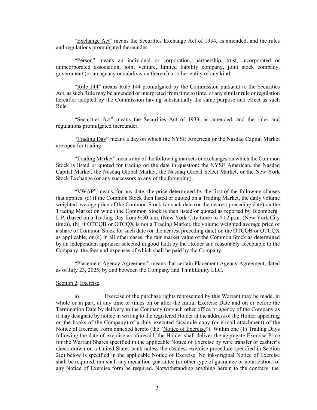 2 “Exchange Act” means the Securities Exchange Act of 1934, as amended, and the rules and regulations promulgated thereunder. “Person” means an individual or corporation, partnership, trust, incorporated or unincorporated association, joint venture, limited liability company, joint stock company, government (or an agency or subdivision thereof) or other entity of any kind. “Rule 144” means Rule 144 promulgated by the Commission pursuant to the Securities Act, as such Rule may be amended or interpreted from time to time, or any similar rule or regulation hereafter adopted by the Commission having substantially the same purpose and effect as such Rule. “Securities Act” means the Securities Act of 1933, as amended, and the rules and regulations promulgated thereunder. “Trading Day” means a day on which the NYSE American or the Nasdaq Capital Market are open for trading. “Trading Market” means any of the following markets or exchanges on which the Common Stock is listed or quoted for trading on the date in question: the NYSE American, the Nasdaq Capital Market, the Nasdaq Global Market, the Nasdaq Global Select Market, or the New York Stock Exchange (or any successors to any of the foregoing). “VWAP” means, for any date, the price determined by the first of the following clauses that applies: (a) if the Common Stock then listed or quoted on a Trading Market, the daily volume weighted average price of the Common Stock for such date (or the nearest preceding date) on the Trading Market on which the Common Stock is then listed or quoted as reported by Bloomberg L.P. (based on a Trading Day from 9:30 a.m. (New York City time) to 4:02 p.m. (New York City time)), (b) if OTCQB or OTCQX is not a Trading Market, the volume weighted average price of a share of Common Stock for such date (or the nearest preceding date) on the OTCQB or OTCQX as applicable, or (c) in all other cases, the fair market value of the Common Stock as determined by an independent appraiser selected in good faith by the Holder and reasonably acceptable to the Company, the fees and expenses of which shall be paid by the Company. “Placement Agency Agreement” means that certain Placement Agency Agreement, dated as of July 23, 2025, by and between the Company and ThinkEquity LLC. Section 2. Exercise. a) Exercise of the purchase rights represented by this Warrant may be made, in whole or in part, at any time or times on or after the Initial Exercise Date and on or before the Termination Date by delivery to the Company (or such other office or agency of the Company as it may designate by notice in writing to the registered Holder at the address of the Holder appearing on the books of the Company) of a duly executed facsimile copy (or e-mail attachment) of the Notice of Exercise Form annexed hereto (the “Notice of Exercise”). Within one (1) Trading Days following the date of exercise as aforesaid, the Holder shall deliver the aggregate Exercise Price for the Warrant Shares specified in the applicable Notice of Exercise by wire transfer or cashier’s check drawn on a United States bank unless the cashless exercise procedure specified in Section 2(c) below is specified in the applicable Notice of Exercise. No ink-original Notice of Exercise shall be required, nor shall any medallion guarantee (or other type of guarantee or notarization) of any Notice of Exercise form be required. Notwithstanding anything herein to the contrary, the