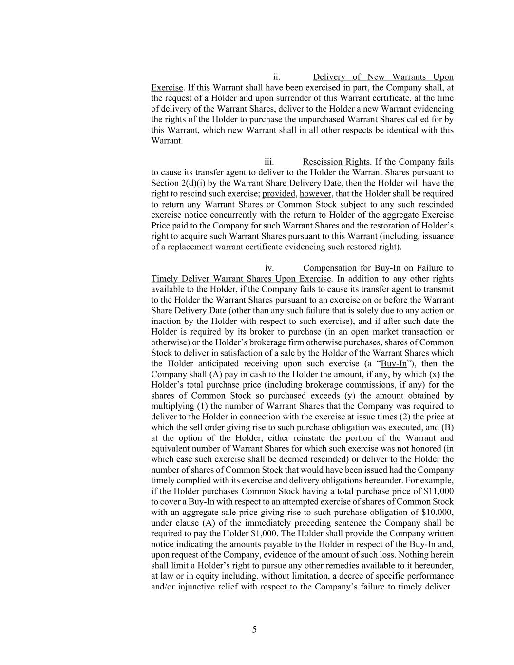 5 ii. Delivery of New Warrants Upon Exercise. If this Warrant shall have been exercised in part, the Company shall, at the request of a Holder and upon surrender of this Warrant certificate, at the time of delivery of the Warrant Shares, deliver to the Holder a new Warrant evidencing the rights of the Holder to purchase the unpurchased Warrant Shares called for by this Warrant, which new Warrant shall in all other respects be identical with this Warrant. iii. Rescission Rights. If the Company fails to cause its transfer agent to deliver to the Holder the Warrant Shares pursuant to Section 2(d)(i) by the Warrant Share Delivery Date, then the Holder will have the right to rescind such exercise; provided, however, that the Holder shall be required to return any Warrant Shares or Common Stock subject to any such rescinded exercise notice concurrently with the return to Holder of the aggregate Exercise Price paid to the Company for such Warrant Shares and the restoration of Holder’s right to acquire such Warrant Shares pursuant to this Warrant (including, issuance of a replacement warrant certificate evidencing such restored right). iv. Compensation for Buy-In on Failure to Timely Deliver Warrant Shares Upon Exercise. In addition to any other rights available to the Holder, if the Company fails to cause its transfer agent to transmit to the Holder the Warrant Shares pursuant to an exercise on or before the Warrant Share Delivery Date (other than any such failure that is solely due to any action or inaction by the Holder with respect to such exercise), and if after such date the Holder is required by its broker to purchase (in an open market transaction or otherwise) or the Holder’s brokerage firm otherwise purchases, shares of Common Stock to deliver in satisfaction of a sale by the Holder of the Warrant Shares which the Holder anticipated receiving upon such exercise (a “Buy-In”), then the Company shall (A) pay in cash to the Holder the amount, if any, by which (x) the Holder’s total purchase price (including brokerage commissions, if any) for the shares of Common Stock so purchased exceeds (y) the amount obtained by multiplying (1) the number of Warrant Shares that the Company was required to deliver to the Holder in connection with the exercise at issue times (2) the price at which the sell order giving rise to such purchase obligation was executed, and (B) at the option of the Holder, either reinstate the portion of the Warrant and equivalent number of Warrant Shares for which such exercise was not honored (in which case such exercise shall be deemed rescinded) or deliver to the Holder the number of shares of Common Stock that would have been issued had the Company timely complied with its exercise and delivery obligations hereunder. For example, if the Holder purchases Common Stock having a total purchase price of $11,000 to cover a Buy-In with respect to an attempted exercise of shares of Common Stock with an aggregate sale price giving rise to such purchase obligation of $10,000, under clause (A) of the immediately preceding sentence the Company shall be required to pay the Holder $1,000. The Holder shall provide the Company written notice indicating the amounts payable to the Holder in respect of the Buy-In and, upon request of the Company, evidence of the amount of such loss. Nothing herein shall limit a Holder’s right to pursue any other remedies available to it hereunder, at law or in equity including, without limitation, a decree of specific performance and/or injunctive relief with respect to the Company’s failure to timely deliver