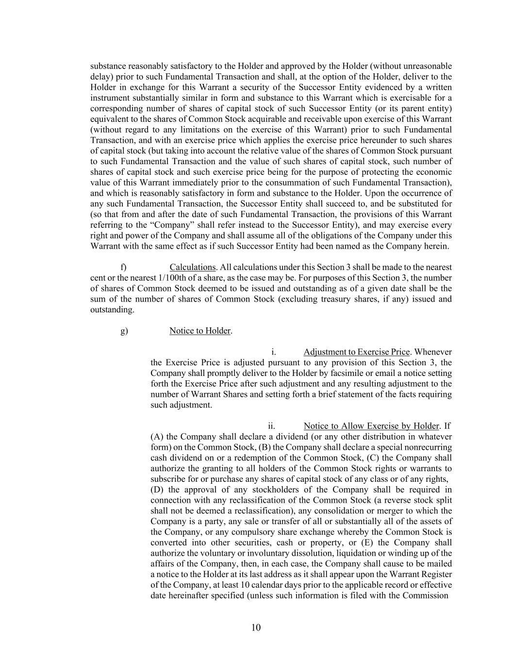 10 substance reasonably satisfactory to the Holder and approved by the Holder (without unreasonable delay) prior to such Fundamental Transaction and shall, at the option of the Holder, deliver to the Holder in exchange for this Warrant a security of the Successor Entity evidenced by a written instrument substantially similar in form and substance to this Warrant which is exercisable for a corresponding number of shares of capital stock of such Successor Entity (or its parent entity) equivalent to the shares of Common Stock acquirable and receivable upon exercise of this Warrant (without regard to any limitations on the exercise of this Warrant) prior to such Fundamental Transaction, and with an exercise price which applies the exercise price hereunder to such shares of capital stock (but taking into account the relative value of the shares of Common Stock pursuant to such Fundamental Transaction and the value of such shares of capital stock, such number of shares of capital stock and such exercise price being for the purpose of protecting the economic value of this Warrant immediately prior to the consummation of such Fundamental Transaction), and which is reasonably satisfactory in form and substance to the Holder. Upon the occurrence of any such Fundamental Transaction, the Successor Entity shall succeed to, and be substituted for (so that from and after the date of such Fundamental Transaction, the provisions of this Warrant referring to the “Company” shall refer instead to the Successor Entity), and may exercise every right and power of the Company and shall assume all of the obligations of the Company under this Warrant with the same effect as if such Successor Entity had been named as the Company herein. f) Calculations. All calculations under this Section 3 shall be made to the nearest cent or the nearest 1/100th of a share, as the case may be. For purposes of this Section 3, the number of shares of Common Stock deemed to be issued and outstanding as of a given date shall be the sum of the number of shares of Common Stock (excluding treasury shares, if any) issued and outstanding. g) Notice to Holder. i. Adjustment to Exercise Price. Whenever the Exercise Price is adjusted pursuant to any provision of this Section 3, the Company shall promptly deliver to the Holder by facsimile or email a notice setting forth the Exercise Price after such adjustment and any resulting adjustment to the number of Warrant Shares and setting forth a brief statement of the facts requiring such adjustment. ii. Notice to Allow Exercise by Holder. If (A) the Company shall declare a dividend (or any other distribution in whatever form) on the Common Stock, (B) the Company shall declare a special nonrecurring cash dividend on or a redemption of the Common Stock, (C) the Company shall authorize the granting to all holders of the Common Stock rights or warrants to subscribe for or purchase any shares of capital stock of any class or of any rights, (D) the approval of any stockholders of the Company shall be required in connection with any reclassification of the Common Stock (a reverse stock split shall not be deemed a reclassification), any consolidation or merger to which the Company is a party, any sale or transfer of all or substantially all of the assets of the Company, or any compulsory share exchange whereby the Common Stock is converted into other securities, cash or property, or (E) the Company shall authorize the voluntary or involuntary dissolution, liquidation or winding up of the affairs of the Company, then, in each case, the Company shall cause to be mailed a notice to the Holder at its last address as it shall appear upon the Warrant Register of the Company, at least 10 calendar days prior to the applicable record or effective date hereinafter specified (unless such information is filed with the Commission