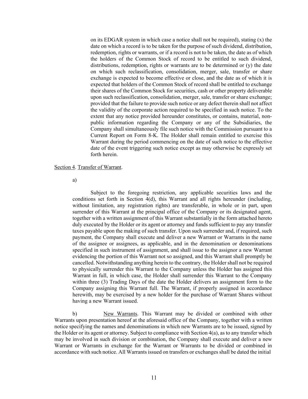 11 on its EDGAR system in which case a notice shall not be required), stating (x) the date on which a record is to be taken for the purpose of such dividend, distribution, redemption, rights or warrants, or if a record is not to be taken, the date as of which the holders of the Common Stock of record to be entitled to such dividend, distributions, redemption, rights or warrants are to be determined or (y) the date on which such reclassification, consolidation, merger, sale, transfer or share exchange is expected to become effective or close, and the date as of which it is expected that holders of the Common Stock of record shall be entitled to exchange their shares of the Common Stock for securities, cash or other property deliverable upon such reclassification, consolidation, merger, sale, transfer or share exchange; provided that the failure to provide such notice or any defect therein shall not affect the validity of the corporate action required to be specified in such notice. To the extent that any notice provided hereunder constitutes, or contains, material, non- public information regarding the Company or any of the Subsidiaries, the Company shall simultaneously file such notice with the Commission pursuant to a Current Report on Form 8-K. The Holder shall remain entitled to exercise this Warrant during the period commencing on the date of such notice to the effective date of the event triggering such notice except as may otherwise be expressly set forth herein. Section 4. Transfer of Warrant. a) Subject to the foregoing restriction, any applicable securities laws and the conditions set forth in Section 4(d), this Warrant and all rights hereunder (including, without limitation, any registration rights) are transferable, in whole or in part, upon surrender of this Warrant at the principal office of the Company or its designated agent, together with a written assignment of this Warrant substantially in the form attached hereto duly executed by the Holder or its agent or attorney and funds sufficient to pay any transfer taxes payable upon the making of such transfer. Upon such surrender and, if required, such payment, the Company shall execute and deliver a new Warrant or Warrants in the name of the assignee or assignees, as applicable, and in the denomination or denominations specified in such instrument of assignment, and shall issue to the assignor a new Warrant evidencing the portion of this Warrant not so assigned, and this Warrant shall promptly be cancelled. Notwithstanding anything herein to the contrary, the Holder shall not be required to physically surrender this Warrant to the Company unless the Holder has assigned this Warrant in full, in which case, the Holder shall surrender this Warrant to the Company within three (3) Trading Days of the date the Holder delivers an assignment form to the Company assigning this Warrant full. The Warrant, if properly assigned in accordance herewith, may be exercised by a new holder for the purchase of Warrant Shares without having a new Warrant issued. b) New Warrants. This Warrant may be divided or combined with other Warrants upon presentation hereof at the aforesaid office of the Company, together with a written notice specifying the names and denominations in which new Warrants are to be issued, signed by the Holder or its agent or attorney. Subject to compliance with Section 4(a), as to any transfer which may be involved in such division or combination, the Company shall execute and deliver a new Warrant or Warrants in exchange for the Warrant or Warrants to be divided or combined in accordance with such notice. All Warrants issued on transfers or exchanges shall be dated the initial
