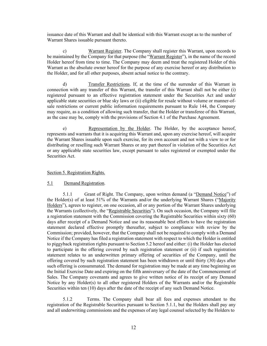 12 issuance date of this Warrant and shall be identical with this Warrant except as to the number of Warrant Shares issuable pursuant thereto. c) Warrant Register. The Company shall register this Warrant, upon records to be maintained by the Company for that purpose (the “Warrant Register”), in the name of the record Holder hereof from time to time. The Company may deem and treat the registered Holder of this Warrant as the absolute owner hereof for the purpose of any exercise hereof or any distribution to the Holder, and for all other purposes, absent actual notice to the contrary. d) Transfer Restrictions. If, at the time of the surrender of this Warrant in connection with any transfer of this Warrant, the transfer of this Warrant shall not be either (i) registered pursuant to an effective registration statement under the Securities Act and under applicable state securities or blue sky laws or (ii) eligible for resale without volume or manner-of- sale restrictions or current public information requirements pursuant to Rule 144, the Company may require, as a condition of allowing such transfer, that the Holder or transferee of this Warrant, as the case may be, comply with the provisions of Section 4.1 of the Purchase Agreement. e) Representation by the Holder. The Holder, by the acceptance hereof, represents and warrants that it is acquiring this Warrant and, upon any exercise hereof, will acquire the Warrant Shares issuable upon such exercise, for its own account and not with a view to or for distributing or reselling such Warrant Shares or any part thereof in violation of the Securities Act or any applicable state securities law, except pursuant to sales registered or exempted under the Securities Act. Section 5. Registration Rights. 5.1 Demand Registration. 5.1.1 Grant of Right. The Company, upon written demand (a “Demand Notice”) of the Holder(s) of at least 51% of the Warrants and/or the underlying Warrant Shares (“Majority Holders”), agrees to register, on one occasion, all or any portion of the Warrant Shares underlying the Warrants (collectively, the “Registrable Securities”). On such occasion, the Company will file a registration statement with the Commission covering the Registrable Securities within sixty (60) days after receipt of a Demand Notice and use its reasonable best efforts to have the registration statement declared effective promptly thereafter, subject to compliance with review by the Commission; provided, however, that the Company shall not be required to comply with a Demand Notice if the Company has filed a registration statement with respect to which the Holder is entitled to piggyback registration rights pursuant to Section 5.2 hereof and either: (i) the Holder has elected to participate in the offering covered by such registration statement or (ii) if such registration statement relates to an underwritten primary offering of securities of the Company, until the offering covered by such registration statement has been withdrawn or until thirty (30) days after such offering is consummated. The demand for registration may be made at any time beginning on the Initial Exercise Date and expiring on the fifth anniversary of the date of the Commencement of Sales. The Company covenants and agrees to give written notice of its receipt of any Demand Notice by any Holder(s) to all other registered Holders of the Warrants and/or the Registrable Securities within ten (10) days after the date of the receipt of any such Demand Notice. 5.1.2 Terms. The Company shall bear all fees and expenses attendant to the registration of the Registrable Securities pursuant to Section 5.1.1, but the Holders shall pay any and all underwriting commissions and the expenses of any legal counsel selected by the Holders to