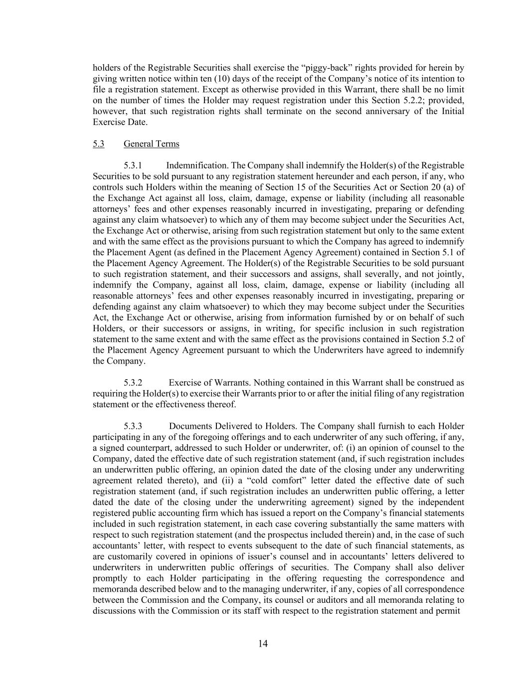 14 holders of the Registrable Securities shall exercise the “piggy-back” rights provided for herein by giving written notice within ten (10) days of the receipt of the Company’s notice of its intention to file a registration statement. Except as otherwise provided in this Warrant, there shall be no limit on the number of times the Holder may request registration under this Section 5.2.2; provided, however, that such registration rights shall terminate on the second anniversary of the Initial Exercise Date. 5.3 General Terms 5.3.1 Indemnification. The Company shall indemnify the Holder(s) of the Registrable Securities to be sold pursuant to any registration statement hereunder and each person, if any, who controls such Holders within the meaning of Section 15 of the Securities Act or Section 20 (a) of the Exchange Act against all loss, claim, damage, expense or liability (including all reasonable attorneys’ fees and other expenses reasonably incurred in investigating, preparing or defending against any claim whatsoever) to which any of them may become subject under the Securities Act, the Exchange Act or otherwise, arising from such registration statement but only to the same extent and with the same effect as the provisions pursuant to which the Company has agreed to indemnify the Placement Agent (as defined in the Placement Agency Agreement) contained in Section 5.1 of the Placement Agency Agreement. The Holder(s) of the Registrable Securities to be sold pursuant to such registration statement, and their successors and assigns, shall severally, and not jointly, indemnify the Company, against all loss, claim, damage, expense or liability (including all reasonable attorneys’ fees and other expenses reasonably incurred in investigating, preparing or defending against any claim whatsoever) to which they may become subject under the Securities Act, the Exchange Act or otherwise, arising from information furnished by or on behalf of such Holders, or their successors or assigns, in writing, for specific inclusion in such registration statement to the same extent and with the same effect as the provisions contained in Section 5.2 of the Placement Agency Agreement pursuant to which the Underwriters have agreed to indemnify the Company. 5.3.2 Exercise of Warrants. Nothing contained in this Warrant shall be construed as requiring the Holder(s) to exercise their Warrants prior to or after the initial filing of any registration statement or the effectiveness thereof. 5.3.3 Documents Delivered to Holders. The Company shall furnish to each Holder participating in any of the foregoing offerings and to each underwriter of any such offering, if any, a signed counterpart, addressed to such Holder or underwriter, of: (i) an opinion of counsel to the Company, dated the effective date of such registration statement (and, if such registration includes an underwritten public offering, an opinion dated the date of the closing under any underwriting agreement related thereto), and (ii) a “cold comfort” letter dated the effective date of such registration statement (and, if such registration includes an underwritten public offering, a letter dated the date of the closing under the underwriting agreement) signed by the independent registered public accounting firm which has issued a report on the Company’s financial statements included in such registration statement, in each case covering substantially the same matters with respect to such registration statement (and the prospectus included therein) and, in the case of such accountants’ letter, with respect to events subsequent to the date of such financial statements, as are customarily covered in opinions of issuer’s counsel and in accountants’ letters delivered to underwriters in underwritten public offerings of securities. The Company shall also deliver promptly to each Holder participating in the offering requesting the correspondence and memoranda described below and to the managing underwriter, if any, copies of all correspondence between the Commission and the Company, its counsel or auditors and all memoranda relating to discussions with the Commission or its staff with respect to the registration statement and permit