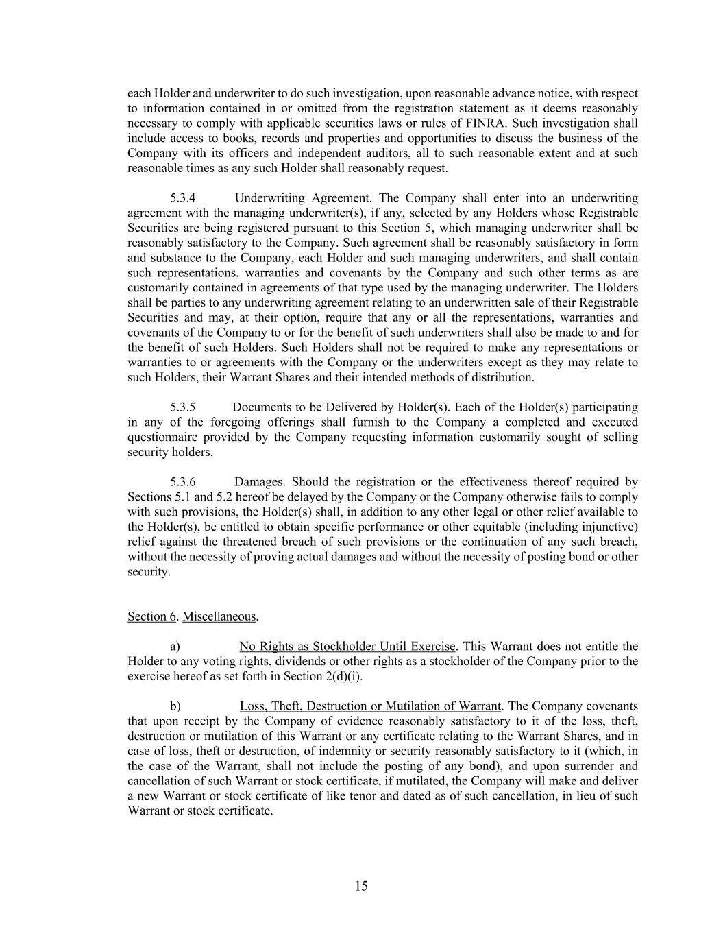 15 each Holder and underwriter to do such investigation, upon reasonable advance notice, with respect to information contained in or omitted from the registration statement as it deems reasonably necessary to comply with applicable securities laws or rules of FINRA. Such investigation shall include access to books, records and properties and opportunities to discuss the business of the Company with its officers and independent auditors, all to such reasonable extent and at such reasonable times as any such Holder shall reasonably request. 5.3.4 Underwriting Agreement. The Company shall enter into an underwriting agreement with the managing underwriter(s), if any, selected by any Holders whose Registrable Securities are being registered pursuant to this Section 5, which managing underwriter shall be reasonably satisfactory to the Company. Such agreement shall be reasonably satisfactory in form and substance to the Company, each Holder and such managing underwriters, and shall contain such representations, warranties and covenants by the Company and such other terms as are customarily contained in agreements of that type used by the managing underwriter. The Holders shall be parties to any underwriting agreement relating to an underwritten sale of their Registrable Securities and may, at their option, require that any or all the representations, warranties and covenants of the Company to or for the benefit of such underwriters shall also be made to and for the benefit of such Holders. Such Holders shall not be required to make any representations or warranties to or agreements with the Company or the underwriters except as they may relate to such Holders, their Warrant Shares and their intended methods of distribution. 5.3.5 Documents to be Delivered by Holder(s). Each of the Holder(s) participating in any of the foregoing offerings shall furnish to the Company a completed and executed questionnaire provided by the Company requesting information customarily sought of selling security holders. 5.3.6 Damages. Should the registration or the effectiveness thereof required by Sections 5.1 and 5.2 hereof be delayed by the Company or the Company otherwise fails to comply with such provisions, the Holder(s) shall, in addition to any other legal or other relief available to the Holder(s), be entitled to obtain specific performance or other equitable (including injunctive) relief against the threatened breach of such provisions or the continuation of any such breach, without the necessity of proving actual damages and without the necessity of posting bond or other security. Section 6. Miscellaneous. a) No Rights as Stockholder Until Exercise. This Warrant does not entitle the Holder to any voting rights, dividends or other rights as a stockholder of the Company prior to the exercise hereof as set forth in Section 2(d)(i). b) Loss, Theft, Destruction or Mutilation of Warrant. The Company covenants that upon receipt by the Company of evidence reasonably satisfactory to it of the loss, theft, destruction or mutilation of this Warrant or any certificate relating to the Warrant Shares, and in case of loss, theft or destruction, of indemnity or security reasonably satisfactory to it (which, in the case of the Warrant, shall not include the posting of any bond), and upon surrender and cancellation of such Warrant or stock certificate, if mutilated, the Company will make and deliver a new Warrant or stock certificate of like tenor and dated as of such cancellation, in lieu of such Warrant or stock certificate.