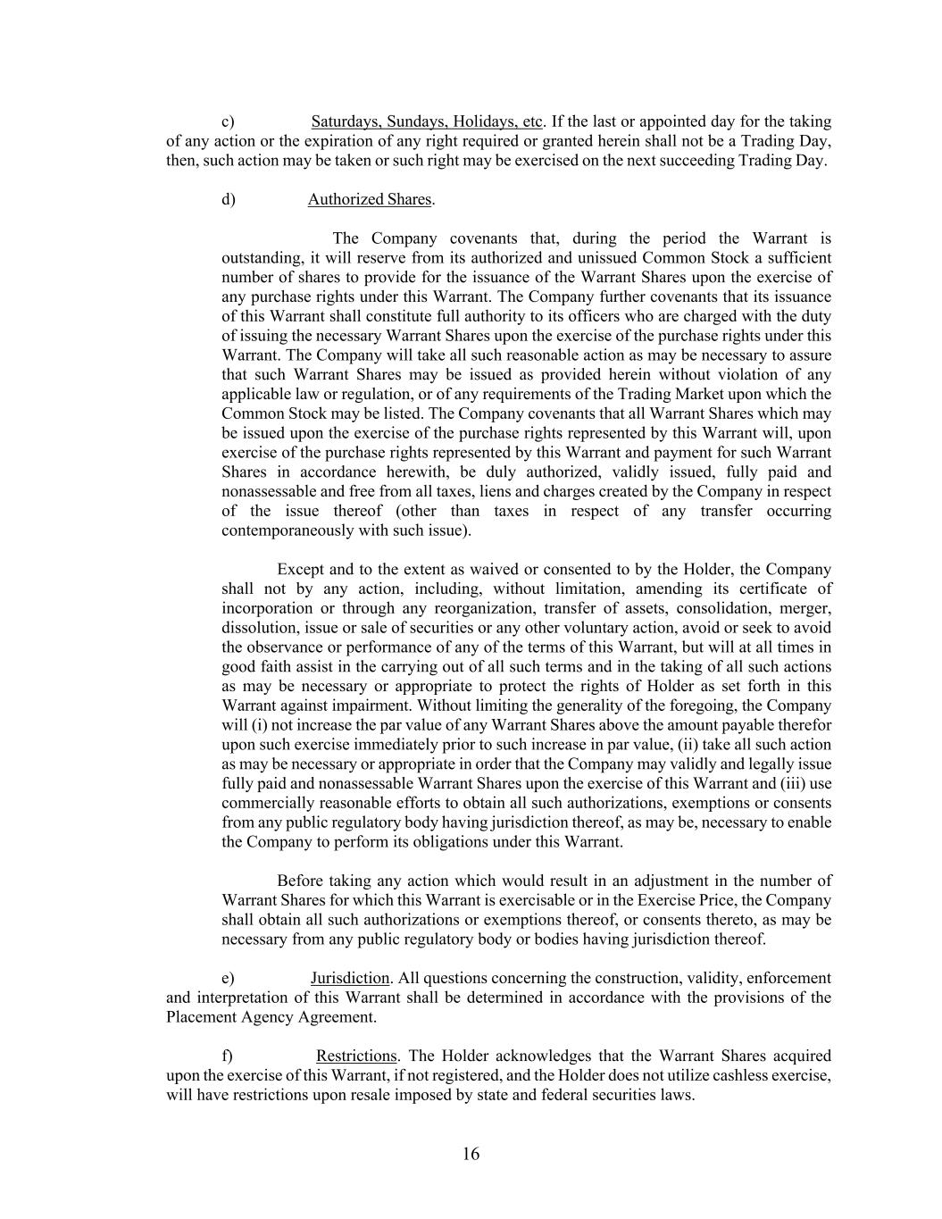 16 c) Saturdays, Sundays, Holidays, etc. If the last or appointed day for the taking of any action or the expiration of any right required or granted herein shall not be a Trading Day, then, such action may be taken or such right may be exercised on the next succeeding Trading Day. d) Authorized Shares. The Company covenants that, during the period the Warrant is outstanding, it will reserve from its authorized and unissued Common Stock a sufficient number of shares to provide for the issuance of the Warrant Shares upon the exercise of any purchase rights under this Warrant. The Company further covenants that its issuance of this Warrant shall constitute full authority to its officers who are charged with the duty of issuing the necessary Warrant Shares upon the exercise of the purchase rights under this Warrant. The Company will take all such reasonable action as may be necessary to assure that such Warrant Shares may be issued as provided herein without violation of any applicable law or regulation, or of any requirements of the Trading Market upon which the Common Stock may be listed. The Company covenants that all Warrant Shares which may be issued upon the exercise of the purchase rights represented by this Warrant will, upon exercise of the purchase rights represented by this Warrant and payment for such Warrant Shares in accordance herewith, be duly authorized, validly issued, fully paid and nonassessable and free from all taxes, liens and charges created by the Company in respect of the issue thereof (other than taxes in respect of any transfer occurring contemporaneously with such issue). Except and to the extent as waived or consented to by the Holder, the Company shall not by any action, including, without limitation, amending its certificate of incorporation or through any reorganization, transfer of assets, consolidation, merger, dissolution, issue or sale of securities or any other voluntary action, avoid or seek to avoid the observance or performance of any of the terms of this Warrant, but will at all times in good faith assist in the carrying out of all such terms and in the taking of all such actions as may be necessary or appropriate to protect the rights of Holder as set forth in this Warrant against impairment. Without limiting the generality of the foregoing, the Company will (i) not increase the par value of any Warrant Shares above the amount payable therefor upon such exercise immediately prior to such increase in par value, (ii) take all such action as may be necessary or appropriate in order that the Company may validly and legally issue fully paid and nonassessable Warrant Shares upon the exercise of this Warrant and (iii) use commercially reasonable efforts to obtain all such authorizations, exemptions or consents from any public regulatory body having jurisdiction thereof, as may be, necessary to enable the Company to perform its obligations under this Warrant. Before taking any action which would result in an adjustment in the number of Warrant Shares for which this Warrant is exercisable or in the Exercise Price, the Company shall obtain all such authorizations or exemptions thereof, or consents thereto, as may be necessary from any public regulatory body or bodies having jurisdiction thereof. e) Jurisdiction. All questions concerning the construction, validity, enforcement and interpretation of this Warrant shall be determined in accordance with the provisions of the Placement Agency Agreement. f) Restrictions. The Holder acknowledges that the Warrant Shares acquired upon the exercise of this Warrant, if not registered, and the Holder does not utilize cashless exercise, will have restrictions upon resale imposed by state and federal securities laws.
