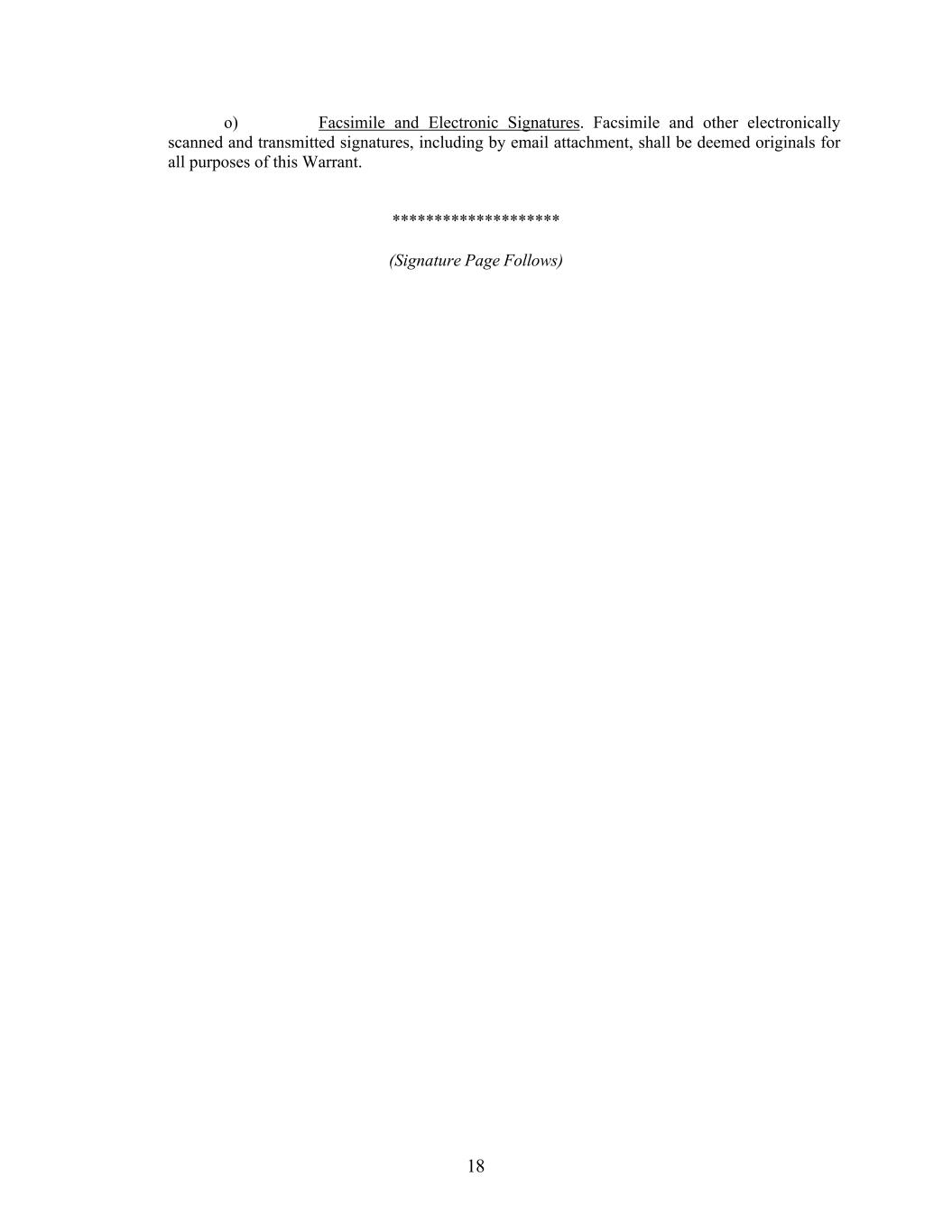 18 o) Facsimile and Electronic Signatures. Facsimile and other electronically scanned and transmitted signatures, including by email attachment, shall be deemed originals for all purposes of this Warrant. ******************** (Signature Page Follows)