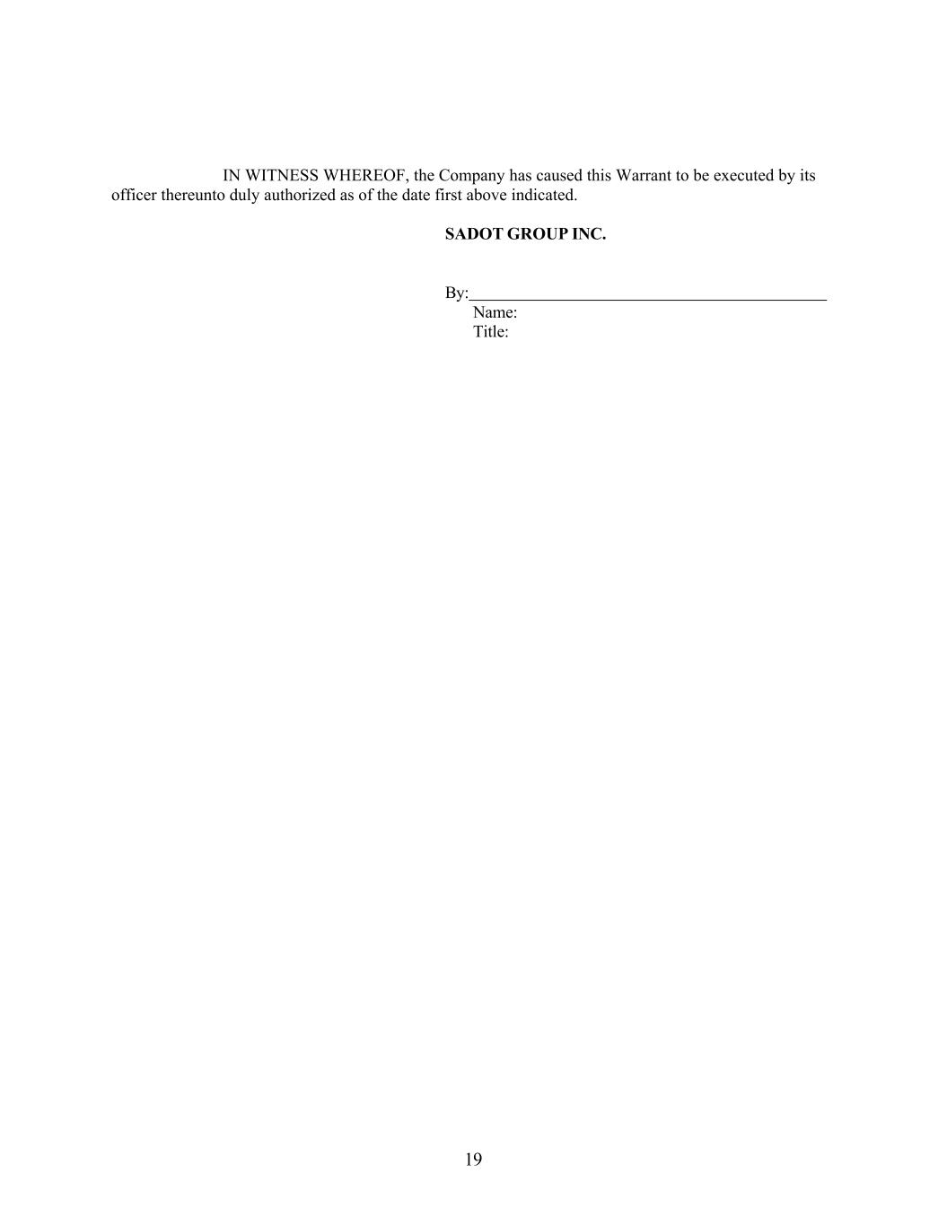 19 IN WITNESS WHEREOF, the Company has caused this Warrant to be executed by its officer thereunto duly authorized as of the date first above indicated. SADOT GROUP INC. By: Name: Title: