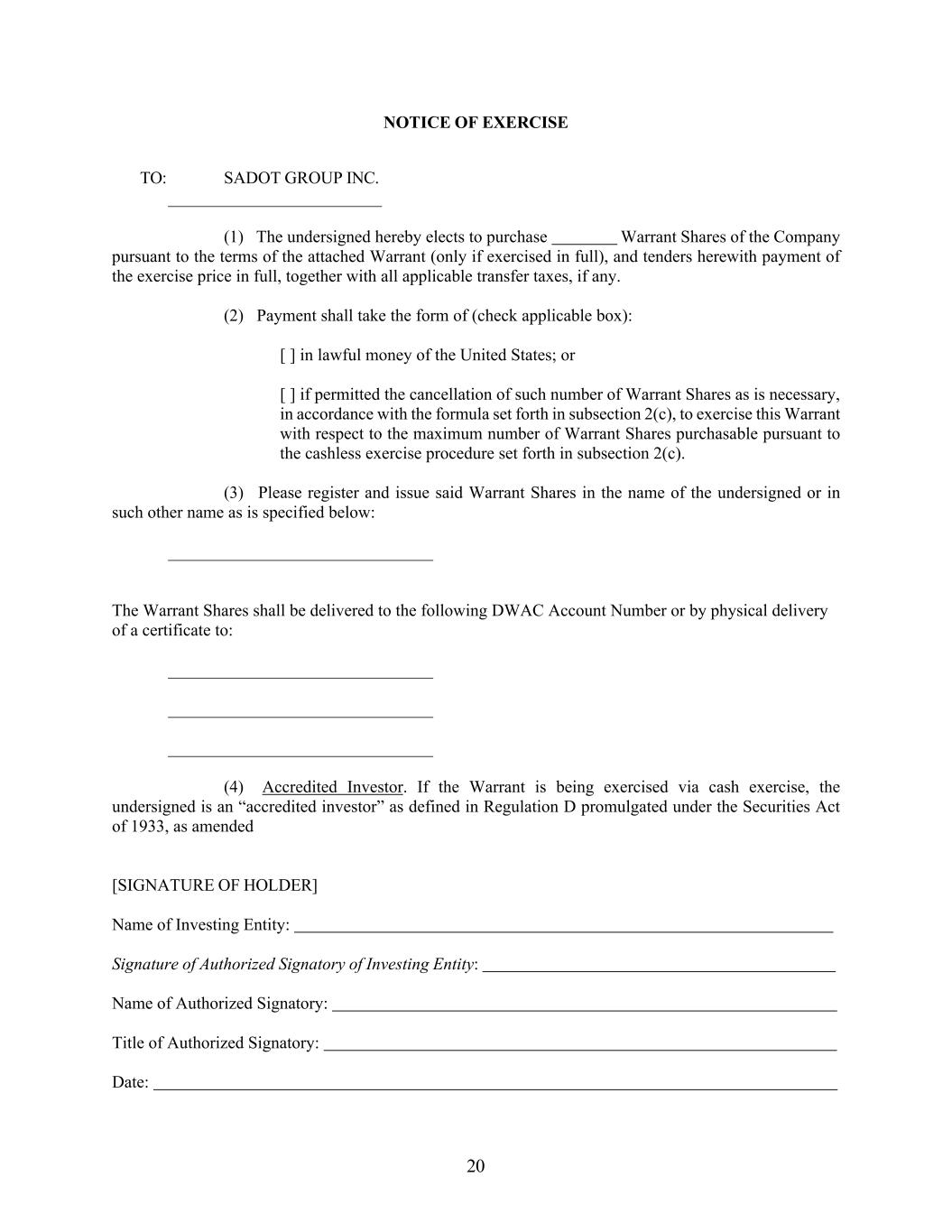 20 NOTICE OF EXERCISE TO: SADOT GROUP INC. (1) The undersigned hereby elects to purchase Warrant Shares of the Company pursuant to the terms of the attached Warrant (only if exercised in full), and tenders herewith payment of the exercise price in full, together with all applicable transfer taxes, if any. (2) Payment shall take the form of (check applicable box): [ ] in lawful money of the United States; or [ ] if permitted the cancellation of such number of Warrant Shares as is necessary, in accordance with the formula set forth in subsection 2(c), to exercise this Warrant with respect to the maximum number of Warrant Shares purchasable pursuant to the cashless exercise procedure set forth in subsection 2(c). (3) Please register and issue said Warrant Shares in the name of the undersigned or in such other name as is specified below: The Warrant Shares shall be delivered to the following DWAC Account Number or by physical delivery of a certificate to: (4) Accredited Investor. If the Warrant is being exercised via cash exercise, the undersigned is an “accredited investor” as defined in Regulation D promulgated under the Securities Act of 1933, as amended [SIGNATURE OF HOLDER] Name of Investing Entity: Signature of Authorized Signatory of Investing Entity: Name of Authorized Signatory: Title of Authorized Signatory: Date: