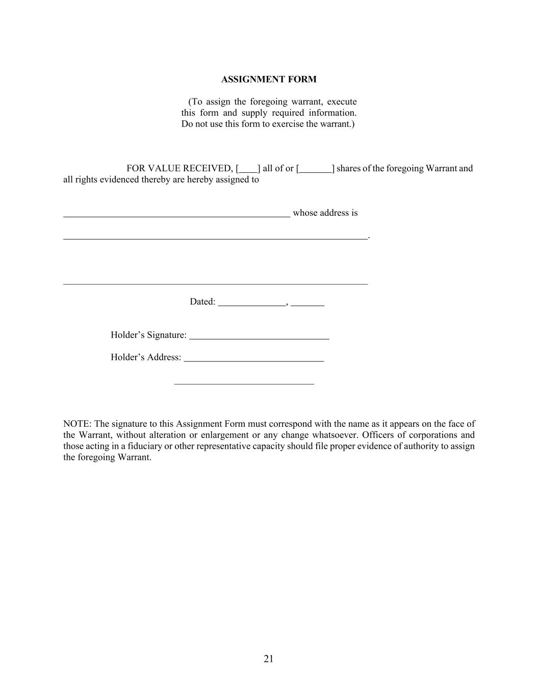 21 ASSIGNMENT FORM (To assign the foregoing warrant, execute this form and supply required information. Do not use this form to exercise the warrant.) FOR VALUE RECEIVED, [ ] all of or [ ] shares of the foregoing Warrant and all rights evidenced thereby are hereby assigned to whose address is . Dated: , Holder’s Signature: Holder’s Address: NOTE: The signature to this Assignment Form must correspond with the name as it appears on the face of the Warrant, without alteration or enlargement or any change whatsoever. Officers of corporations and those acting in a fiduciary or other representative capacity should file proper evidence of authority to assign the foregoing Warrant.