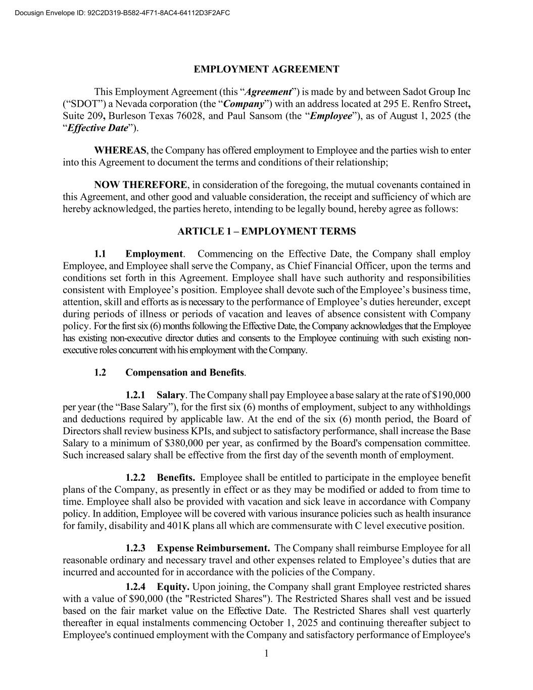 1 EMPLOYMENT AGREEMENT This Employment Agreement (this “Agreement”) is made by and between Sadot Group Inc (“SDOT”) a Nevada corporation (the “Company”) with an address located at 295 E. Renfro Street, Suite 209, Burleson Texas 76028, and Paul Sansom (the “Employee”), as of August 1, 2025 (the “Effective Date”). WHEREAS, the Company has offered employment to Employee and the parties wish to enter into this Agreement to document the terms and conditions of their relationship; NOW THEREFORE, in consideration of the foregoing, the mutual covenants contained in this Agreement, and other good and valuable consideration, the receipt and sufficiency of which are hereby acknowledged, the parties hereto, intending to be legally bound, hereby agree as follows: ARTICLE 1 – EMPLOYMENT TERMS 1.1 Employment. Commencing on the Effective Date, the Company shall employ Employee, and Employee shall serve the Company, as Chief Financial Officer, upon the terms and conditions set forth in this Agreement. Employee shall have such authority and responsibilities consistent with Employee’s position. Employee shall devote such of the Employee’s business time, attention, skill and efforts as is necessary to the performance of Employee’s duties hereunder, except during periods of illness or periods of vacation and leaves of absence consistent with Company policy. For the first six (6) months following the Effective Date, the Company acknowledges that the Employee has existing non-executive director duties and consents to the Employee continuing with such existing non- executive roles concurrent with his employment with the Company. 1.2 Compensation and Benefits. 1.2.1 Salary. The Company shall pay Employee a base salary at the rate of $190,000 per year (the “Base Salary”), for the first six (6) months of employment, subject to any withholdings and deductions required by applicable law. At the end of the six (6) month period, the Board of Directors shall review business KPIs, and subject to satisfactory performance, shall increase the Base Salary to a minimum of $380,000 per year, as confirmed by the Board's compensation committee. Such increased salary shall be effective from the first day of the seventh month of employment. 1.2.2 Benefits. Employee shall be entitled to participate in the employee benefit plans of the Company, as presently in effect or as they may be modified or added to from time to time. Employee shall also be provided with vacation and sick leave in accordance with Company policy. In addition, Employee will be covered with various insurance policies such as health insurance for family, disability and 401K plans all which are commensurate with C level executive position. 1.2.3 Expense Reimbursement. The Company shall reimburse Employee for all reasonable ordinary and necessary travel and other expenses related to Employee’s duties that are incurred and accounted for in accordance with the policies of the Company. 1.2.4 Equity. Upon joining, the Company shall grant Employee restricted shares with a value of $90,000 (the "Restricted Shares"). The Restricted Shares shall vest and be issued based on the fair market value on the Effective Date. The Restricted Shares shall vest quarterly thereafter in equal instalments commencing October 1, 2025 and continuing thereafter subject to Employee's continued employment with the Company and satisfactory performance of Employee's Docusign Envelope ID: 92C2D319-B582-4F71-8AC4-64112D3F2AFC