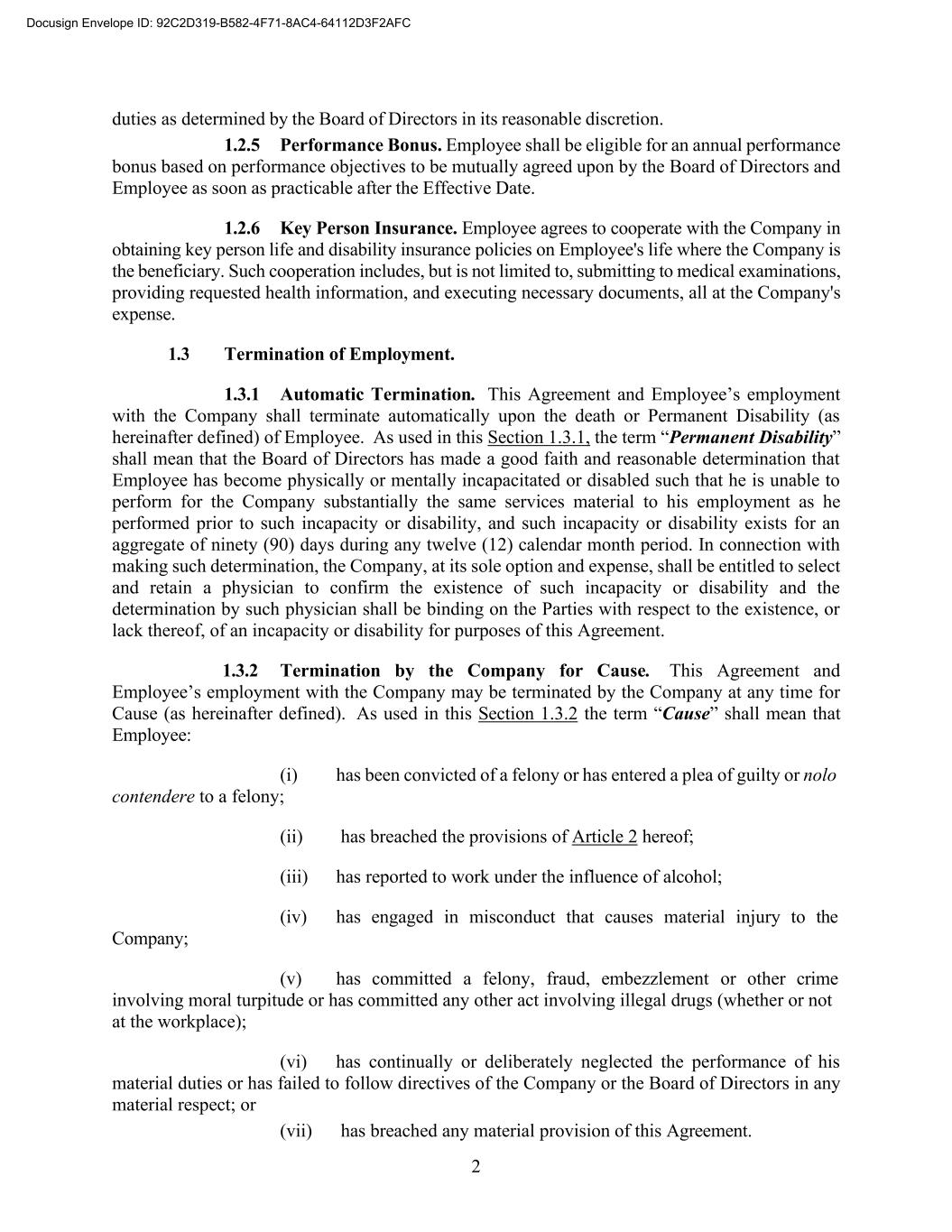 2 duties as determined by the Board of Directors in its reasonable discretion. 1.2.5 Performance Bonus. Employee shall be eligible for an annual performance bonus based on performance objectives to be mutually agreed upon by the Board of Directors and Employee as soon as practicable after the Effective Date. 1.2.6 Key Person Insurance. Employee agrees to cooperate with the Company in obtaining key person life and disability insurance policies on Employee's life where the Company is the beneficiary. Such cooperation includes, but is not limited to, submitting to medical examinations, providing requested health information, and executing necessary documents, all at the Company's expense. 1.3 Termination of Employment. 1.3.1 Automatic Termination. This Agreement and Employee’s employment with the Company shall terminate automatically upon the death or Permanent Disability (as hereinafter defined) of Employee. As used in this Section 1.3.1, the term “Permanent Disability” shall mean that the Board of Directors has made a good faith and reasonable determination that Employee has become physically or mentally incapacitated or disabled such that he is unable to perform for the Company substantially the same services material to his employment as he performed prior to such incapacity or disability, and such incapacity or disability exists for an aggregate of ninety (90) days during any twelve (12) calendar month period. In connection with making such determination, the Company, at its sole option and expense, shall be entitled to select and retain a physician to confirm the existence of such incapacity or disability and the determination by such physician shall be binding on the Parties with respect to the existence, or lack thereof, of an incapacity or disability for purposes of this Agreement. 1.3.2 Termination by the Company for Cause. This Agreement and Employee’s employment with the Company may be terminated by the Company at any time for Cause (as hereinafter defined). As used in this Section 1.3.2 the term “Cause” shall mean that Employee: (i) has been convicted of a felony or has entered a plea of guilty or nolo contendere to a felony; (ii) has breached the provisions of Article 2 hereof; (iii) has reported to work under the influence of alcohol; (iv) has engaged in misconduct that causes material injury to the Company; (v) has committed a felony, fraud, embezzlement or other crime involving moral turpitude or has committed any other act involving illegal drugs (whether or not at the workplace); (vi) has continually or deliberately neglected the performance of his material duties or has failed to follow directives of the Company or the Board of Directors in any material respect; or (vii) has breached any material provision of this Agreement. Docusign Envelope ID: 92C2D319-B582-4F71-8AC4-64112D3F2AFC