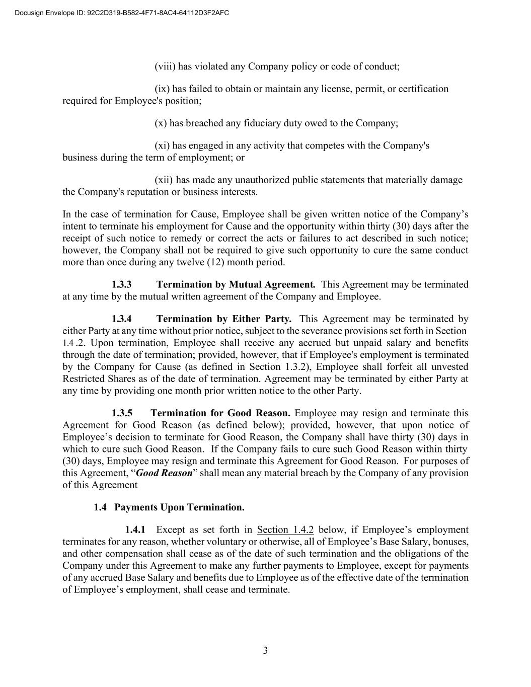 3 (viii) has violated any Company policy or code of conduct; (ix) has failed to obtain or maintain any license, permit, or certification required for Employee's position; (x) has breached any fiduciary duty owed to the Company; (xi) has engaged in any activity that competes with the Company's business during the term of employment; or (xii) has made any unauthorized public statements that materially damage the Company's reputation or business interests. In the case of termination for Cause, Employee shall be given written notice of the Company’s intent to terminate his employment for Cause and the opportunity within thirty (30) days after the receipt of such notice to remedy or correct the acts or failures to act described in such notice; however, the Company shall not be required to give such opportunity to cure the same conduct more than once during any twelve (12) month period. 1.3.3 Termination by Mutual Agreement. This Agreement may be terminated at any time by the mutual written agreement of the Company and Employee. 1.3.4 Termination by Either Party. This Agreement may be terminated by either Party at any time without prior notice, subject to the severance provisions set forth in Section 1.4 .2. Upon termination, Employee shall receive any accrued but unpaid salary and benefits through the date of termination; provided, however, that if Employee's employment is terminated by the Company for Cause (as defined in Section 1.3.2), Employee shall forfeit all unvested Restricted Shares as of the date of termination. Agreement may be terminated by either Party at any time by providing one month prior written notice to the other Party. 1.3.5 Termination for Good Reason. Employee may resign and terminate this Agreement for Good Reason (as defined below); provided, however, that upon notice of Employee’s decision to terminate for Good Reason, the Company shall have thirty (30) days in which to cure such Good Reason. If the Company fails to cure such Good Reason within thirty (30) days, Employee may resign and terminate this Agreement for Good Reason. For purposes of this Agreement, “Good Reason” shall mean any material breach by the Company of any provision of this Agreement 1.4 Payments Upon Termination. 1.4.1 Except as set forth in Section 1.4.2 below, if Employee’s employment terminates for any reason, whether voluntary or otherwise, all of Employee’s Base Salary, bonuses, and other compensation shall cease as of the date of such termination and the obligations of the Company under this Agreement to make any further payments to Employee, except for payments of any accrued Base Salary and benefits due to Employee as of the effective date of the termination of Employee’s employment, shall cease and terminate. Docusign Envelope ID: 92C2D319-B582-4F71-8AC4-64112D3F2AFC
