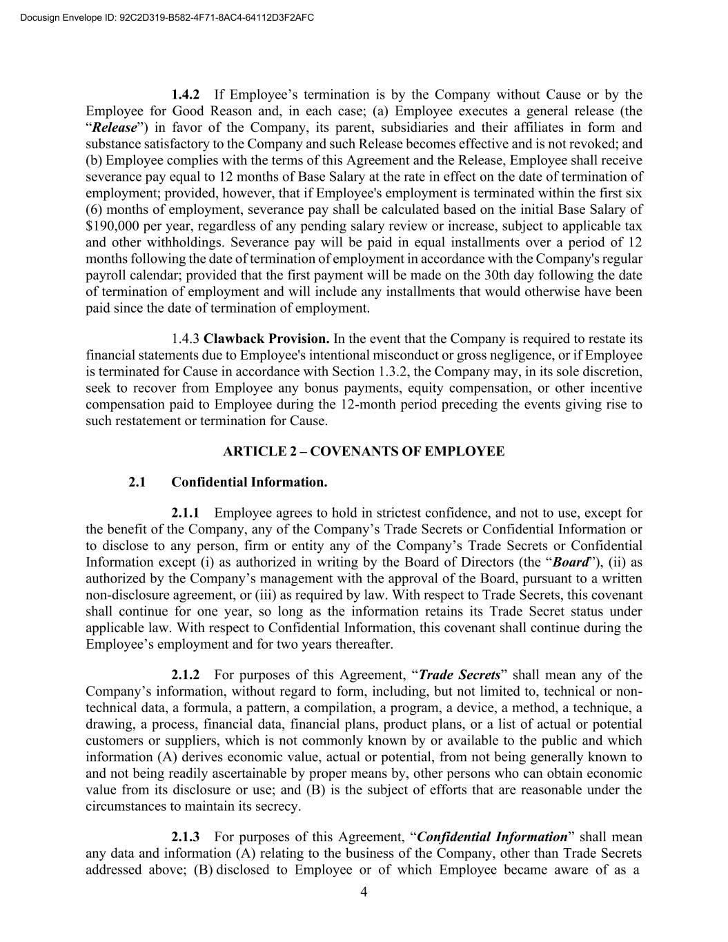 4 1.4.2 If Employee’s termination is by the Company without Cause or by the Employee for Good Reason and, in each case; (a) Employee executes a general release (the “Release”) in favor of the Company, its parent, subsidiaries and their affiliates in form and substance satisfactory to the Company and such Release becomes effective and is not revoked; and (b) Employee complies with the terms of this Agreement and the Release, Employee shall receive severance pay equal to 12 months of Base Salary at the rate in effect on the date of termination of employment; provided, however, that if Employee's employment is terminated within the first six (6) months of employment, severance pay shall be calculated based on the initial Base Salary of $190,000 per year, regardless of any pending salary review or increase, subject to applicable tax and other withholdings. Severance pay will be paid in equal installments over a period of 12 months following the date of termination of employment in accordance with the Company's regular payroll calendar; provided that the first payment will be made on the 30th day following the date of termination of employment and will include any installments that would otherwise have been paid since the date of termination of employment. 1.4.3 Clawback Provision. In the event that the Company is required to restate its financial statements due to Employee's intentional misconduct or gross negligence, or if Employee is terminated for Cause in accordance with Section 1.3.2, the Company may, in its sole discretion, seek to recover from Employee any bonus payments, equity compensation, or other incentive compensation paid to Employee during the 12-month period preceding the events giving rise to such restatement or termination for Cause. ARTICLE 2 – COVENANTS OF EMPLOYEE 2.1 Confidential Information. 2.1.1 Employee agrees to hold in strictest confidence, and not to use, except for the benefit of the Company, any of the Company’s Trade Secrets or Confidential Information or to disclose to any person, firm or entity any of the Company’s Trade Secrets or Confidential Information except (i) as authorized in writing by the Board of Directors (the “Board”), (ii) as authorized by the Company’s management with the approval of the Board, pursuant to a written non-disclosure agreement, or (iii) as required by law. With respect to Trade Secrets, this covenant shall continue for one year, so long as the information retains its Trade Secret status under applicable law. With respect to Confidential Information, this covenant shall continue during the Employee’s employment and for two years thereafter. 2.1.2 For purposes of this Agreement, “Trade Secrets” shall mean any of the Company’s information, without regard to form, including, but not limited to, technical or non- technical data, a formula, a pattern, a compilation, a program, a device, a method, a technique, a drawing, a process, financial data, financial plans, product plans, or a list of actual or potential customers or suppliers, which is not commonly known by or available to the public and which information (A) derives economic value, actual or potential, from not being generally known to and not being readily ascertainable by proper means by, other persons who can obtain economic value from its disclosure or use; and (B) is the subject of efforts that are reasonable under the circumstances to maintain its secrecy. 2.1.3 For purposes of this Agreement, “Confidential Information” shall mean any data and information (A) relating to the business of the Company, other than Trade Secrets addressed above; (B) disclosed to Employee or of which Employee became aware of as a Docusign Envelope ID: 92C2D319-B582-4F71-8AC4-64112D3F2AFC