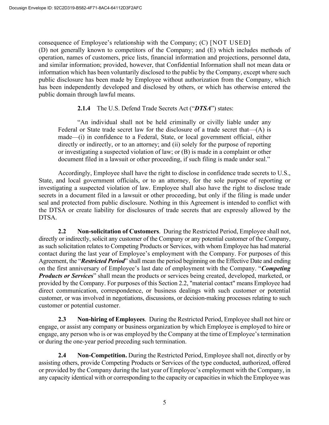 5 consequence of Employee’s relationship with the Company; (C) [NOT USED] (D) not generally known to competitors of the Company; and (E) which includes methods of operation, names of customers, price lists, financial information and projections, personnel data, and similar information; provided, however, that Confidential Information shall not mean data or information which has been voluntarily disclosed to the public by the Company, except where such public disclosure has been made by Employee without authorization from the Company, which has been independently developed and disclosed by others, or which has otherwise entered the public domain through lawful means. 2.1.4 The U.S. Defend Trade Secrets Act (“DTSA”) states: “An individual shall not be held criminally or civilly liable under any Federal or State trade secret law for the disclosure of a trade secret that—(A) is made—(i) in confidence to a Federal, State, or local government official, either directly or indirectly, or to an attorney; and (ii) solely for the purpose of reporting or investigating a suspected violation of law; or (B) is made in a complaint or other document filed in a lawsuit or other proceeding, if such filing is made under seal.” Accordingly, Employee shall have the right to disclose in confidence trade secrets to U.S., State, and local government officials, or to an attorney, for the sole purpose of reporting or investigating a suspected violation of law. Employee shall also have the right to disclose trade secrets in a document filed in a lawsuit or other proceeding, but only if the filing is made under seal and protected from public disclosure. Nothing in this Agreement is intended to conflict with the DTSA or create liability for disclosures of trade secrets that are expressly allowed by the DTSA. 2.2 Non-solicitation of Customers. During the Restricted Period, Employee shall not, directly or indirectly, solicit any customer of the Company or any potential customer of the Company, as such solicitation relates to Competing Products or Services, with whom Employee has had material contact during the last year of Employee’s employment with the Company. For purposes of this Agreement, the “Restricted Period” shall mean the period beginning on the Effective Date and ending on the first anniversary of Employee’s last date of employment with the Company. “Competing Products or Services” shall mean the products or services being created, developed, marketed, or provided by the Company. For purposes of this Section 2.2, "material contact" means Employee had direct communication, correspondence, or business dealings with such customer or potential customer, or was involved in negotiations, discussions, or decision-making processes relating to such customer or potential customer. 2.3 Non-hiring of Employees. During the Restricted Period, Employee shall not hire or engage, or assist any company or business organization by which Employee is employed to hire or engage, any person who is or was employed by the Company at the time of Employee’s termination or during the one-year period preceding such termination. 2.4 Non-Competition. During the Restricted Period, Employee shall not, directly or by assisting others, provide Competing Products or Services of the type conducted, authorized, offered or provided by the Company during the last year of Employee’s employment with the Company, in any capacity identical with or corresponding to the capacity or capacities in which the Employee was Docusign Envelope ID: 92C2D319-B582-4F71-8AC4-64112D3F2AFC