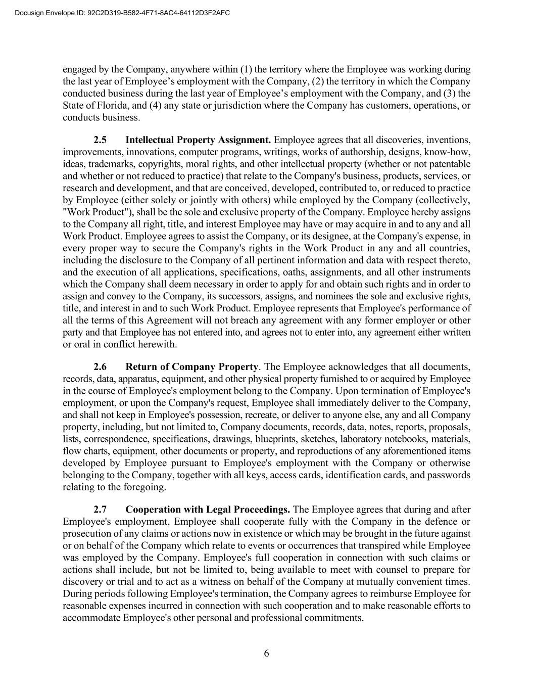 6 engaged by the Company, anywhere within (1) the territory where the Employee was working during the last year of Employee’s employment with the Company, (2) the territory in which the Company conducted business during the last year of Employee’s employment with the Company, and (3) the State of Florida, and (4) any state or jurisdiction where the Company has customers, operations, or conducts business. 2.5 Intellectual Property Assignment. Employee agrees that all discoveries, inventions, improvements, innovations, computer programs, writings, works of authorship, designs, know-how, ideas, trademarks, copyrights, moral rights, and other intellectual property (whether or not patentable and whether or not reduced to practice) that relate to the Company's business, products, services, or research and development, and that are conceived, developed, contributed to, or reduced to practice by Employee (either solely or jointly with others) while employed by the Company (collectively, "Work Product"), shall be the sole and exclusive property of the Company. Employee hereby assigns to the Company all right, title, and interest Employee may have or may acquire in and to any and all Work Product. Employee agrees to assist the Company, or its designee, at the Company's expense, in every proper way to secure the Company's rights in the Work Product in any and all countries, including the disclosure to the Company of all pertinent information and data with respect thereto, and the execution of all applications, specifications, oaths, assignments, and all other instruments which the Company shall deem necessary in order to apply for and obtain such rights and in order to assign and convey to the Company, its successors, assigns, and nominees the sole and exclusive rights, title, and interest in and to such Work Product. Employee represents that Employee's performance of all the terms of this Agreement will not breach any agreement with any former employer or other party and that Employee has not entered into, and agrees not to enter into, any agreement either written or oral in conflict herewith. 2.6 Return of Company Property. The Employee acknowledges that all documents, records, data, apparatus, equipment, and other physical property furnished to or acquired by Employee in the course of Employee's employment belong to the Company. Upon termination of Employee's employment, or upon the Company's request, Employee shall immediately deliver to the Company, and shall not keep in Employee's possession, recreate, or deliver to anyone else, any and all Company property, including, but not limited to, Company documents, records, data, notes, reports, proposals, lists, correspondence, specifications, drawings, blueprints, sketches, laboratory notebooks, materials, flow charts, equipment, other documents or property, and reproductions of any aforementioned items developed by Employee pursuant to Employee's employment with the Company or otherwise belonging to the Company, together with all keys, access cards, identification cards, and passwords relating to the foregoing. 2.7 Cooperation with Legal Proceedings. The Employee agrees that during and after Employee's employment, Employee shall cooperate fully with the Company in the defence or prosecution of any claims or actions now in existence or which may be brought in the future against or on behalf of the Company which relate to events or occurrences that transpired while Employee was employed by the Company. Employee's full cooperation in connection with such claims or actions shall include, but not be limited to, being available to meet with counsel to prepare for discovery or trial and to act as a witness on behalf of the Company at mutually convenient times. During periods following Employee's termination, the Company agrees to reimburse Employee for reasonable expenses incurred in connection with such cooperation and to make reasonable efforts to accommodate Employee's other personal and professional commitments. Docusign Envelope ID: 92C2D319-B582-4F71-8AC4-64112D3F2AFC