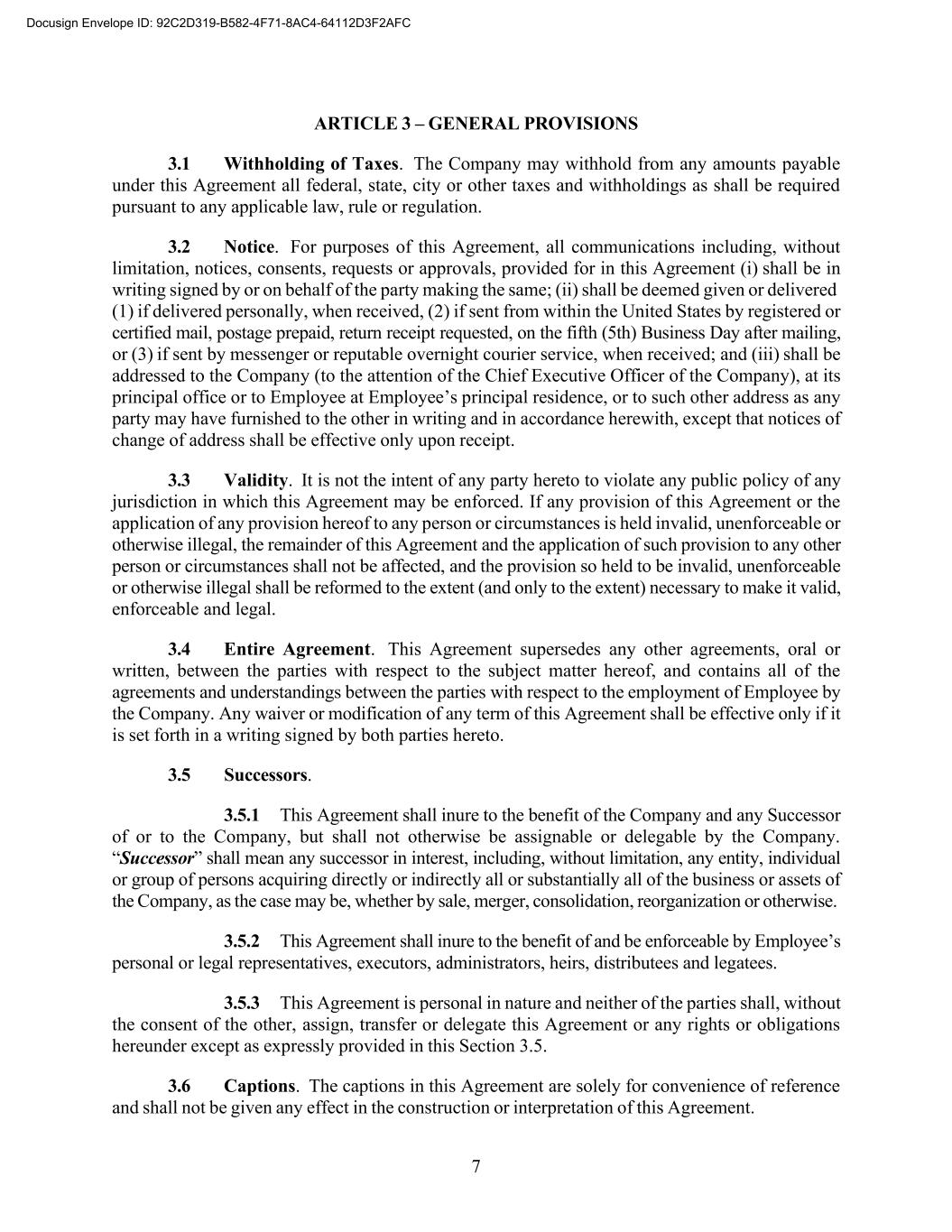 7 ARTICLE 3 – GENERAL PROVISIONS 3.1 Withholding of Taxes. The Company may withhold from any amounts payable under this Agreement all federal, state, city or other taxes and withholdings as shall be required pursuant to any applicable law, rule or regulation. 3.2 Notice. For purposes of this Agreement, all communications including, without limitation, notices, consents, requests or approvals, provided for in this Agreement (i) shall be in writing signed by or on behalf of the party making the same; (ii) shall be deemed given or delivered (1) if delivered personally, when received, (2) if sent from within the United States by registered or certified mail, postage prepaid, return receipt requested, on the fifth (5th) Business Day after mailing, or (3) if sent by messenger or reputable overnight courier service, when received; and (iii) shall be addressed to the Company (to the attention of the Chief Executive Officer of the Company), at its principal office or to Employee at Employee’s principal residence, or to such other address as any party may have furnished to the other in writing and in accordance herewith, except that notices of change of address shall be effective only upon receipt. 3.3 Validity. It is not the intent of any party hereto to violate any public policy of any jurisdiction in which this Agreement may be enforced. If any provision of this Agreement or the application of any provision hereof to any person or circumstances is held invalid, unenforceable or otherwise illegal, the remainder of this Agreement and the application of such provision to any other person or circumstances shall not be affected, and the provision so held to be invalid, unenforceable or otherwise illegal shall be reformed to the extent (and only to the extent) necessary to make it valid, enforceable and legal. 3.4 Entire Agreement. This Agreement supersedes any other agreements, oral or written, between the parties with respect to the subject matter hereof, and contains all of the agreements and understandings between the parties with respect to the employment of Employee by the Company. Any waiver or modification of any term of this Agreement shall be effective only if it is set forth in a writing signed by both parties hereto. 3.5 Successors. 3.5.1 This Agreement shall inure to the benefit of the Company and any Successor of or to the Company, but shall not otherwise be assignable or delegable by the Company. “Successor” shall mean any successor in interest, including, without limitation, any entity, individual or group of persons acquiring directly or indirectly all or substantially all of the business or assets of the Company, as the case may be, whether by sale, merger, consolidation, reorganization or otherwise. 3.5.2 This Agreement shall inure to the benefit of and be enforceable by Employee’s personal or legal representatives, executors, administrators, heirs, distributees and legatees. 3.5.3 This Agreement is personal in nature and neither of the parties shall, without the consent of the other, assign, transfer or delegate this Agreement or any rights or obligations hereunder except as expressly provided in this Section 3.5. 3.6 Captions. The captions in this Agreement are solely for convenience of reference and shall not be given any effect in the construction or interpretation of this Agreement. Docusign Envelope ID: 92C2D319-B582-4F71-8AC4-64112D3F2AFC